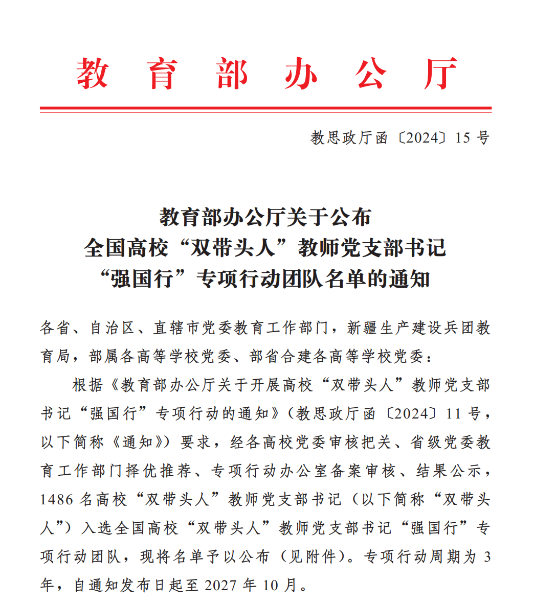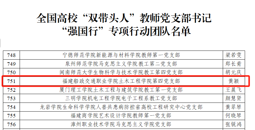 近日,教育部辦公廳公布了全國高校“雙帶頭人”教師黨支部書記“強(qiáng)國行”專項(xiàng)行動團(tuán)隊名單,土木工程學(xué)院第四黨支部(負(fù)責(zé)人:黃穎)入選全國高?!半p帶頭人”教師黨支部書記“強(qiáng)國行”專項(xiàng)行動團(tuán)隊。