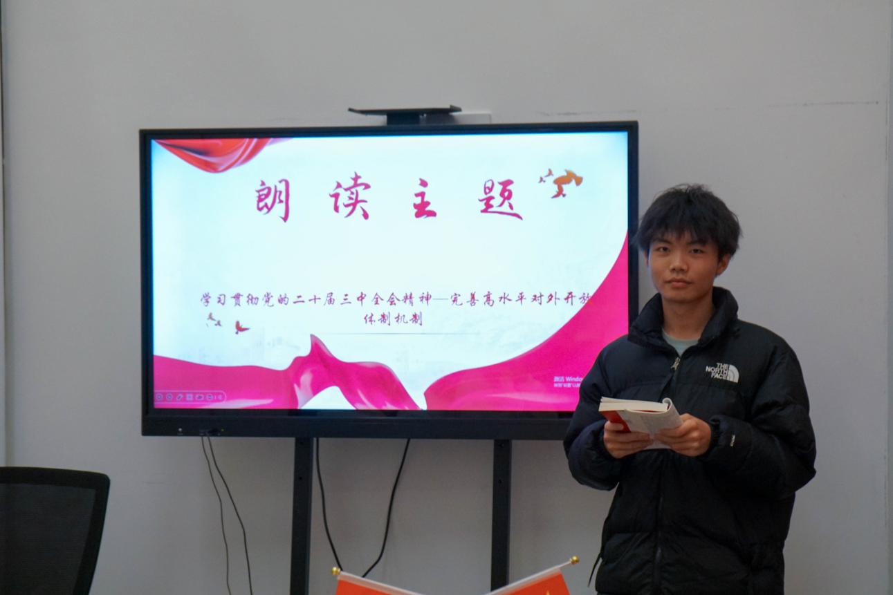 分享會(huì)上,2024級(jí)道路與橋梁工程技術(shù)1班團(tuán)支書林雨涵,領(lǐng)學(xué)朗讀了《中共中央關(guān)于進(jìn)一步全面深化改革、推進(jìn)中國(guó)式現(xiàn)代化的決定》(后文簡(jiǎn)稱《決定》)“完善高水平對(duì)外開放體制機(jī)制”部分。