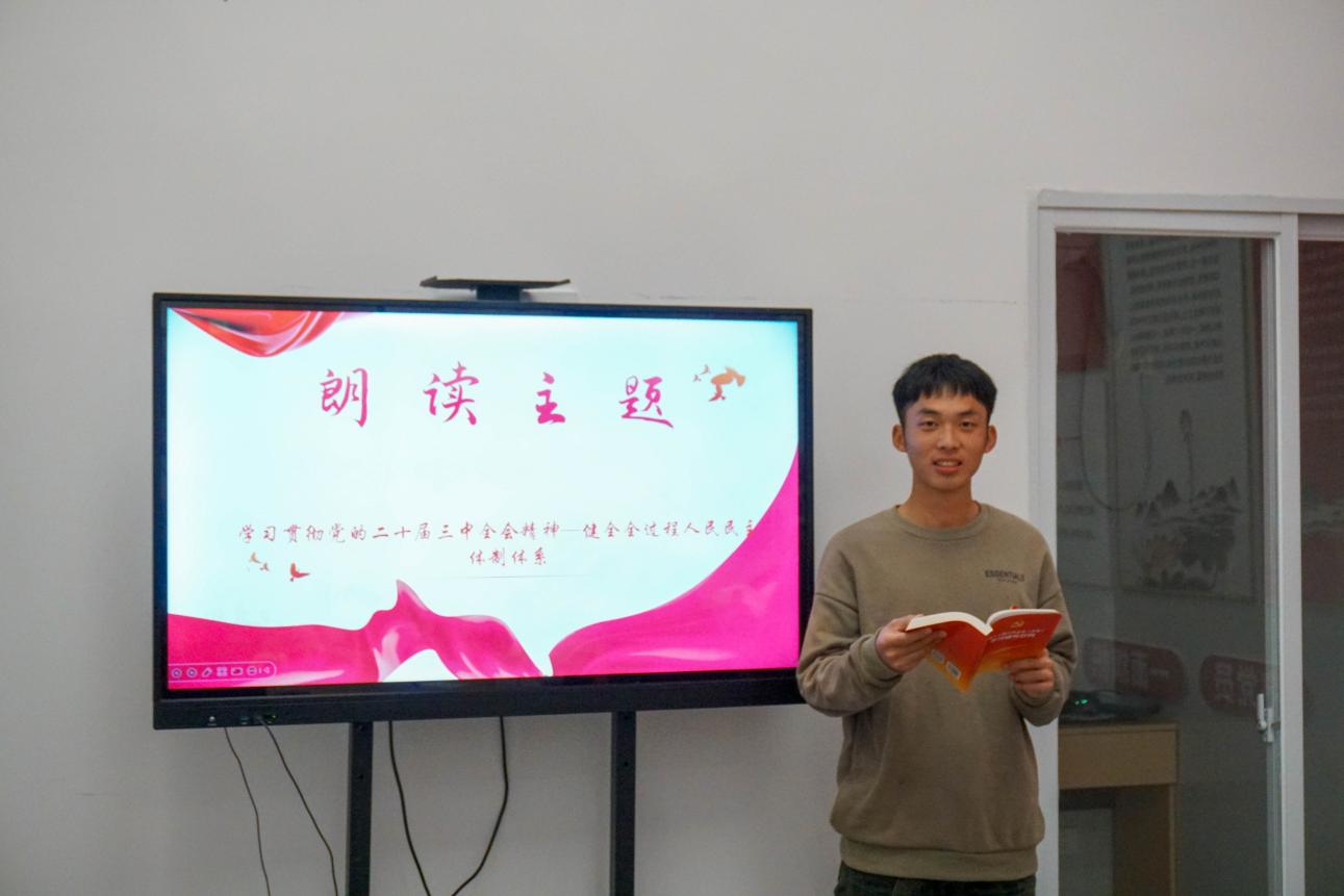 分享會上,2024級道路與橋梁工程技術(shù)2班班長唐韶宇,土木學(xué)院合唱團(tuán)成員,國旗護(hù)衛(wèi)隊(duì)社團(tuán)成員,領(lǐng)學(xué)朗讀了《中共中央關(guān)于進(jìn)一步全面深化改革、推進(jìn)中國式現(xiàn)代化的決定》(后文簡稱《決定》)“健全全過程人民民主體制體系”部分。