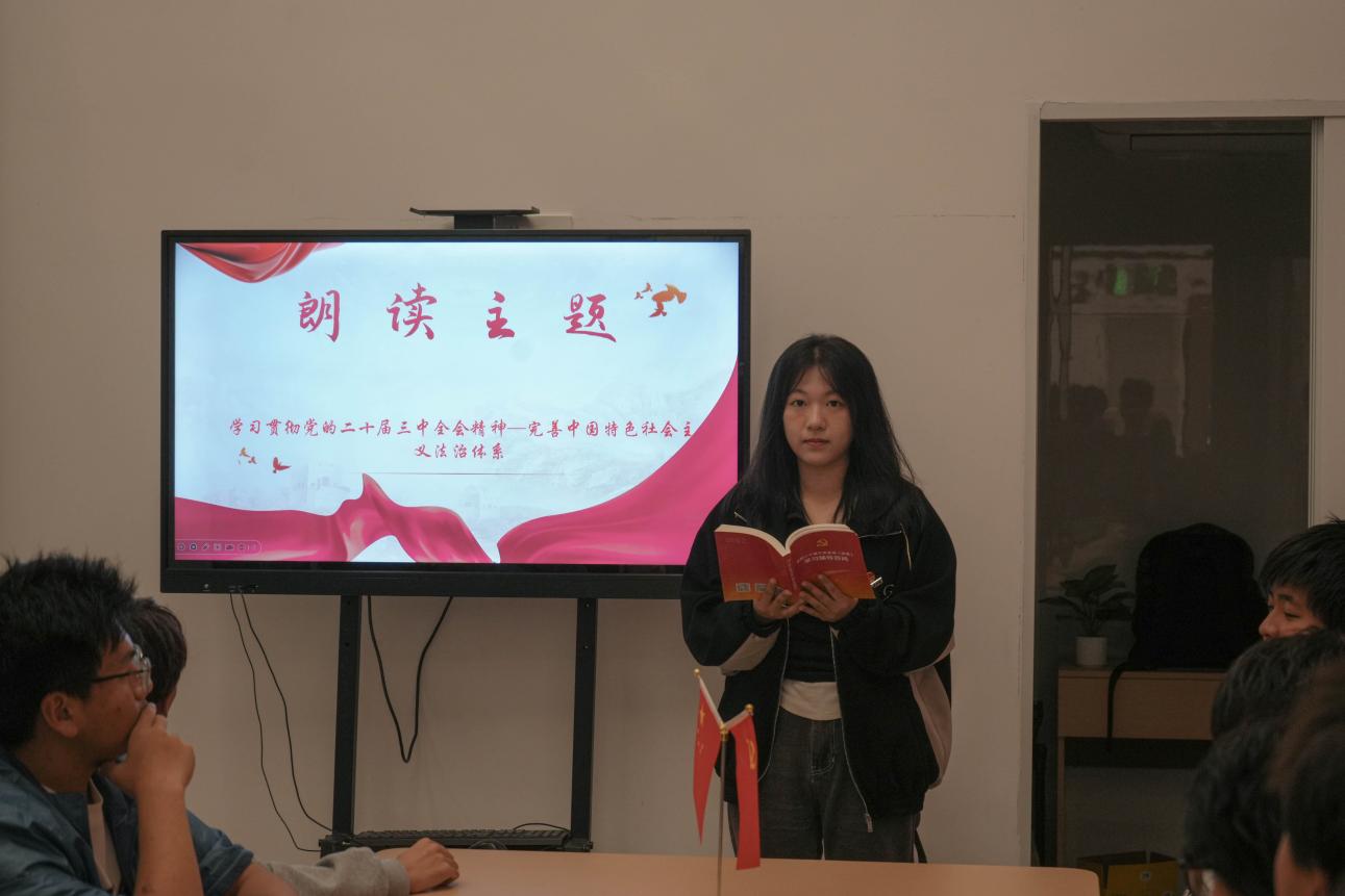分享會上,2024級道路與橋梁工程技術(shù)3班學習委員陳雯,土木工程學院兩委辦成員,領(lǐng)學朗讀了《中共中央關(guān)于進一步全面深化改革、推進中國式現(xiàn)代化的決定》(后文簡稱《決定》)“完善中國特色社會主義法治體系”部分。