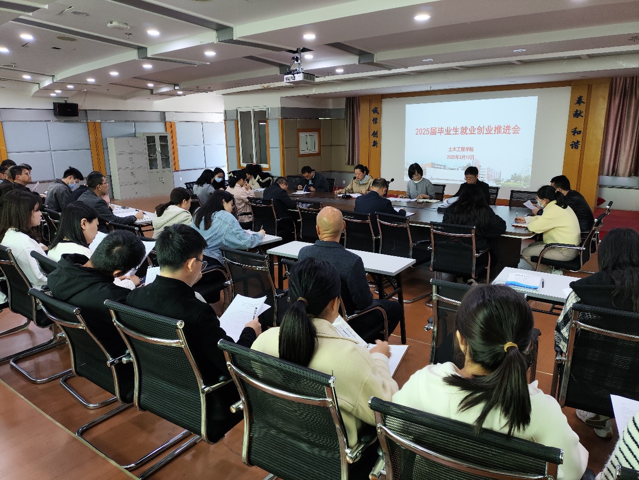 會(huì)議傳達(dá)了2025屆全國(guó)高校畢業(yè)生春季學(xué)期就業(yè)重點(diǎn)工作推進(jìn)視頻會(huì)議、學(xué)校2025年春季學(xué)期促就業(yè)推進(jìn)會(huì)精神,學(xué)習(xí)了《土木工程學(xué)院2025屆畢業(yè)生就業(yè)創(chuàng)業(yè)工作推進(jìn)方案》,通報(bào)了學(xué)院2025屆畢業(yè)生當(dāng)前就業(yè)情況,并對(duì)新學(xué)期就業(yè)創(chuàng)業(yè)工作進(jìn)行詳細(xì)部署。