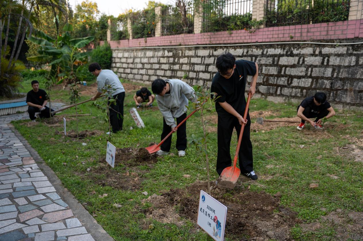 植樹(shù)活動(dòng)當(dāng)日,師生們齊聚農(nóng)場(chǎng),共同開(kāi)啟這場(chǎng)綠色征程。此次種植的樹(shù)木種類豐富,有象征吉祥的桂花樹(shù)、寓意繁榮的石榴樹(shù) ,還有甜蜜美好的荔枝樹(shù)和蘊(yùn)含美好寓意的木瓜樹(shù)。同學(xué)們熱情高漲,有的揮鍬鏟土,動(dòng)作嫻熟有力;有的小心翼翼地將果苗放入坑中,輕輕扶正,眼中滿是期待;老師們則在一旁耐心指導(dǎo),分享著植樹(shù)經(jīng)驗(yàn)與技巧。