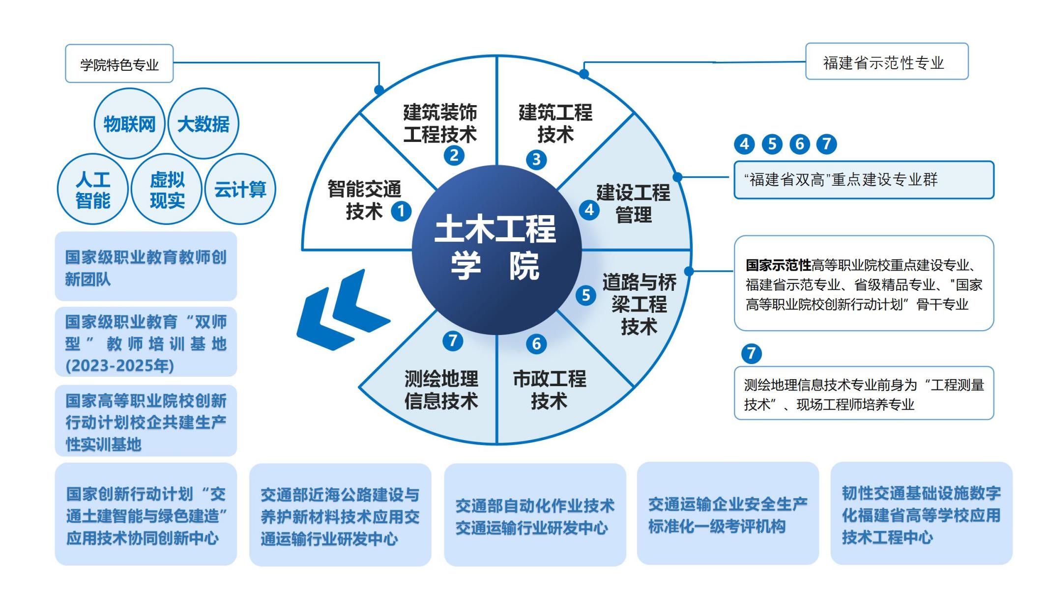 5 | 建筑工程技術(shù) | ①福建省示范性專業(yè); ②住房和城鄉(xiāng)建設(shè)領(lǐng)域施工現(xiàn)場專業(yè)人員培訓(xùn)考核站點(diǎn); ③課程體系緊跟智能建造發(fā)展趨勢,服務(wù)城市更新,融入BIM、裝配式等新技術(shù),打造現(xiàn)代高質(zhì)量職業(yè)教育典范。 | 智慧筑城,更新華章 匠心智造,開啟未來 |