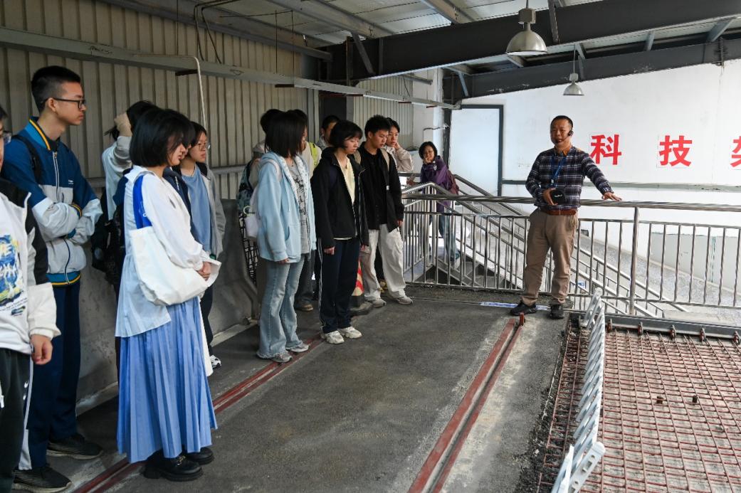 在橋梁工程研學模塊中,路橋專業(yè)教師們通過“理論講解 + 現(xiàn)場實踐”的模式,幫助同學們深入了解橋梁的施工過程與特點。教師們先在教室內(nèi)講解不同橋梁的類型及其特點,隨后帶領學生前往交通土建標準化施工產(chǎn)教融合實訓基地,參觀路、橋、隧、基坑、邊坡等 1:1 實體模型,讓學生親身體驗交通土建工程的施工藝。同時,借助BIM + GIS管養(yǎng)平臺展示,學生們直觀了解了橋梁健康監(jiān)測系統(tǒng)運作機理,熟悉了現(xiàn)代土木工程的信息化管理和智能化養(yǎng)護技術。