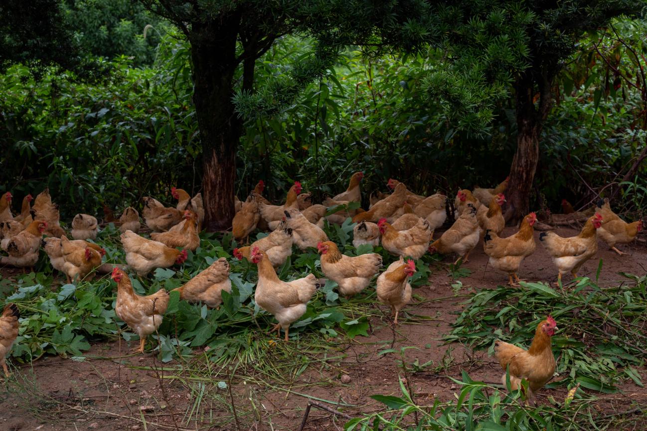 據(jù)介紹,這里曾經(jīng)是寸草不生、水土流失嚴(yán)重的稀土礦廢棄場(chǎng)。2006年,雞場(chǎng)創(chuàng)辦人藍(lán)曉紅承包村里的500畝荒山,開(kāi)始了“種樹(shù)+養(yǎng)雞”的綠色生態(tài)雞場(chǎng)建設(shè)事業(yè)。此后的日子在“種樹(shù)—養(yǎng)雞—賣(mài)雞苗—種樹(shù)”中循環(huán)往復(fù),藍(lán)曉紅在銷(xiāo)售雞苗過(guò)程中,每到一地都要帶回不少樹(shù)苗。多年來(lái),她種下桂花、油茶、毛竹、紅豆杉等苗木1萬(wàn)余株,終于將這里變成了綠樹(shù)成蔭、雞鳥(niǎo)爭(zhēng)鳴的美麗綠洲。水土生態(tài)的改善也為河田雞的養(yǎng)殖提供了天然場(chǎng)所。雞奔走綠林山間,食百草飛蟲(chóng),飲山泉溪水,成為了營(yíng)養(yǎng)豐富、口感緊實(shí)的世界名雞。而雞的雞糞又為林子提供了養(yǎng)料,儼然形成了一種共生共存的可持續(xù)發(fā)展模式。