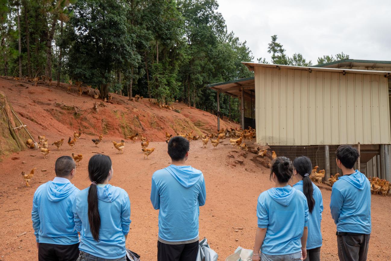 圖5:實(shí)踐團(tuán)師生在蘭秀河田雞場(chǎng)近距離觀摩生態(tài)雞舍