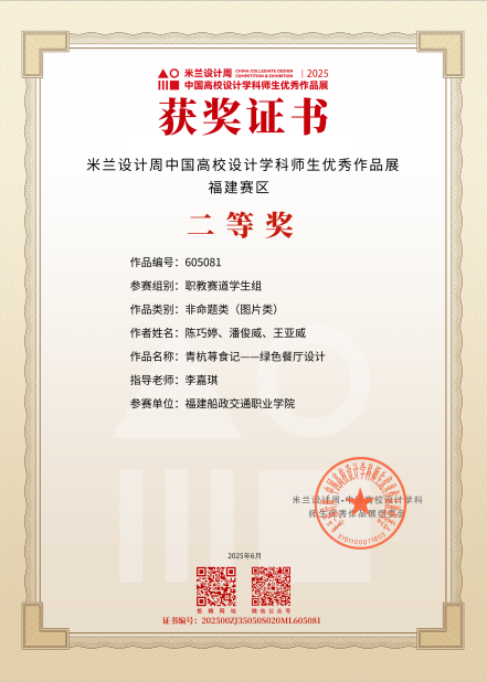 近日,由中國(guó)教育國(guó)際交流協(xié)會(huì)、中國(guó)高等教育學(xué)會(huì)聯(lián)合主辦的第九屆“米蘭設(shè)計(jì)周中國(guó)高校設(shè)計(jì)學(xué)科師生優(yōu)秀作品展”主題競(jìng)賽評(píng)審結(jié)果正式公布。學(xué)院建筑裝飾工程技術(shù)專業(yè)學(xué)生踴躍參賽并喜獲佳績(jī),共獲職教賽道非命題類福建賽區(qū)二等獎(jiǎng)1項(xiàng)、三等獎(jiǎng)1項(xiàng)。其中,作品《青杭蕁食記--綠色餐廳設(shè)計(jì)》榮獲二等獎(jiǎng),《家創(chuàng)生活——居住空間設(shè)計(jì)》榮獲三等獎(jiǎng)。