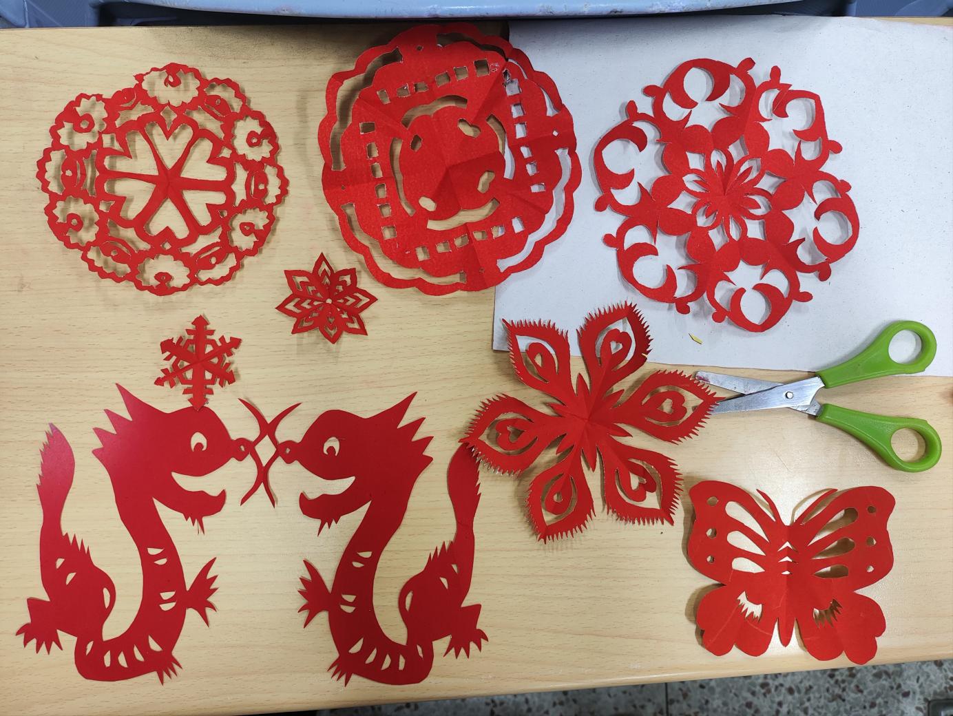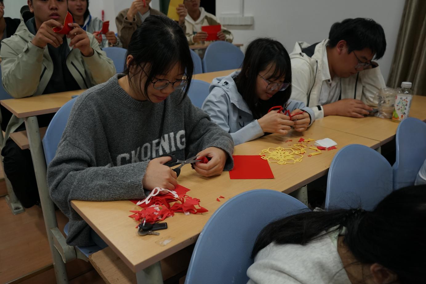 進入實踐創(chuàng)作環(huán)節(jié),董老師親自示范指導,耐心解答學生們的疑問。同學們熱情高漲、踴躍參與,紅紙在指尖翻飛,剪刀在紙上流轉,一個個獨具巧思的圖案逐漸成型。