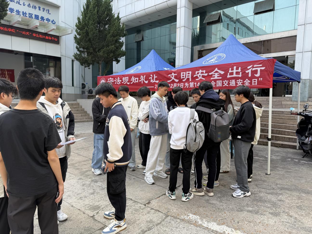 為深入貫徹落實交通安全相關(guān)法律法規(guī),切實增強學生的交通安全意識、提升文明出行素養(yǎng)。2025年12月2日,在第14個“全國交通安全日”來臨之際,土木工程學院于福航園“一站式”學生社區(qū)服務中心開展以“守法規(guī)知禮讓,文明安全出行”為主題的交通安全宣傳教育活動。