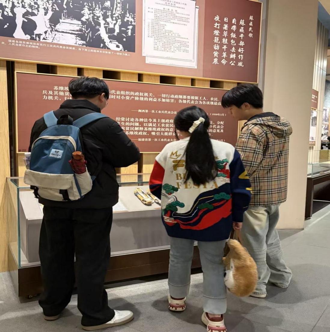 隨后,實(shí)踐隊(duì)前往福建省革命歷史紀(jì)念館。隊(duì)員們循著八閩革命的歷史脈絡(luò)緩步前行,在一個(gè)個(gè)陳列展區(qū)前駐足凝望。泛黃的老照片、斑駁的革命文物、生動(dòng)的場(chǎng)景復(fù)原與翔實(shí)的文字史料,將福建人民從鴉片戰(zhàn)爭(zhēng)后的不屈抗?fàn)?,到土地革命時(shí)期蘇區(qū)創(chuàng)建、長(zhǎng)征路上浴血奮戰(zhàn),再到福州解放的崢嶸歲月徐徐鋪展。葉飛將軍體內(nèi)留存數(shù)十年的子彈頭、蘇區(qū)軍民用過(guò)的舊農(nóng)具、戰(zhàn)時(shí)傳遞情報(bào)的密信,一件件珍貴展品讓塵封的歷史變得鮮活,隊(duì)員們?cè)隈v足聆聽與凝神細(xì)看間,真切感悟著八閩兒女堅(jiān)韌不拔、前仆后繼的革命奮斗精神,深刻體會(huì)到紅色江山的來(lái)之不易。