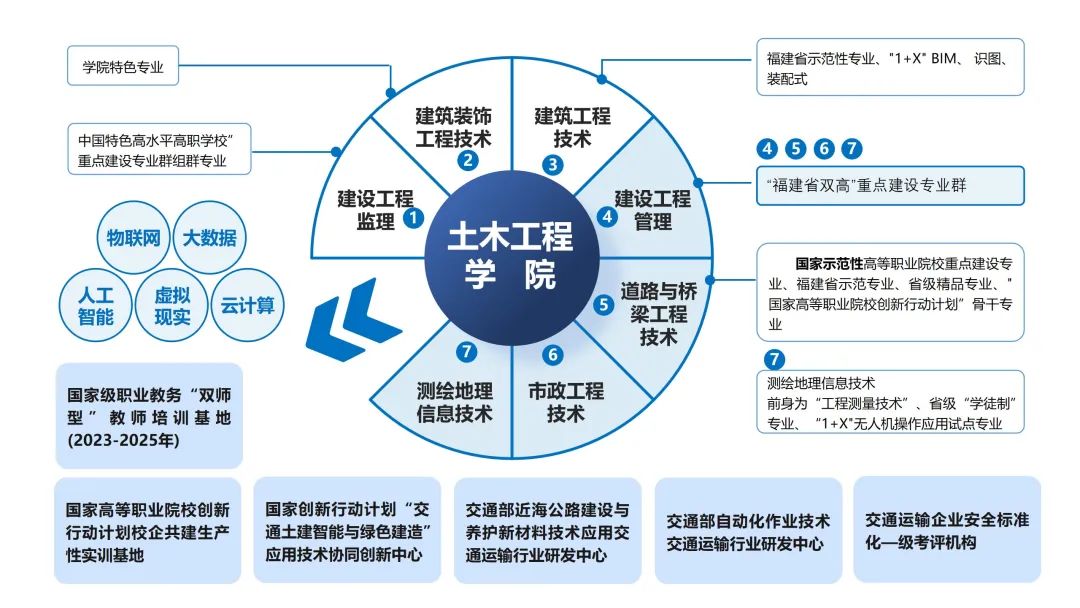 土木工程學(xué)院現(xiàn)有道路與橋梁工程技術(shù)、市政工程技術(shù)、建設(shè)工程監(jiān)理、測繪地理信息技術(shù)、建筑工程技術(shù)、建設(shè)工程管理、建筑裝飾工程技術(shù)7個(gè)專業(yè)。其中,道路與橋梁工程技術(shù)是首批國家示范性高等職業(yè)院校建設(shè)計(jì)劃中央財(cái)政重點(diǎn)支持建設(shè)的專業(yè)(簡稱“首批國家示范性建設(shè)重點(diǎn)專業(yè)”)、國家創(chuàng)新發(fā)展行動(dòng)計(jì)劃骨干專業(yè)、福建省示范專業(yè)、福建省精品專業(yè),“福建省雙高”重點(diǎn)建設(shè)專業(yè)群的核心專業(yè),2017年通過IEET國際認(rèn)證;建設(shè)工程監(jiān)理專業(yè)是“中國特色高水平高職學(xué)校與高水平專業(yè)建設(shè)計(jì)劃”(簡稱“國家雙高”)高水平專業(yè)群的組群專業(yè);市政工程技術(shù)、測繪地理信息技術(shù)、建設(shè)工程管理專業(yè)是“福建省雙高”重點(diǎn)建設(shè)專業(yè)群(道路與橋梁工程技術(shù)專業(yè)群)的組群專業(yè);建筑工程技術(shù)是福建省高職院校示范性專業(yè);建筑裝飾工程技術(shù)專業(yè)為學(xué)校特色專業(yè)。