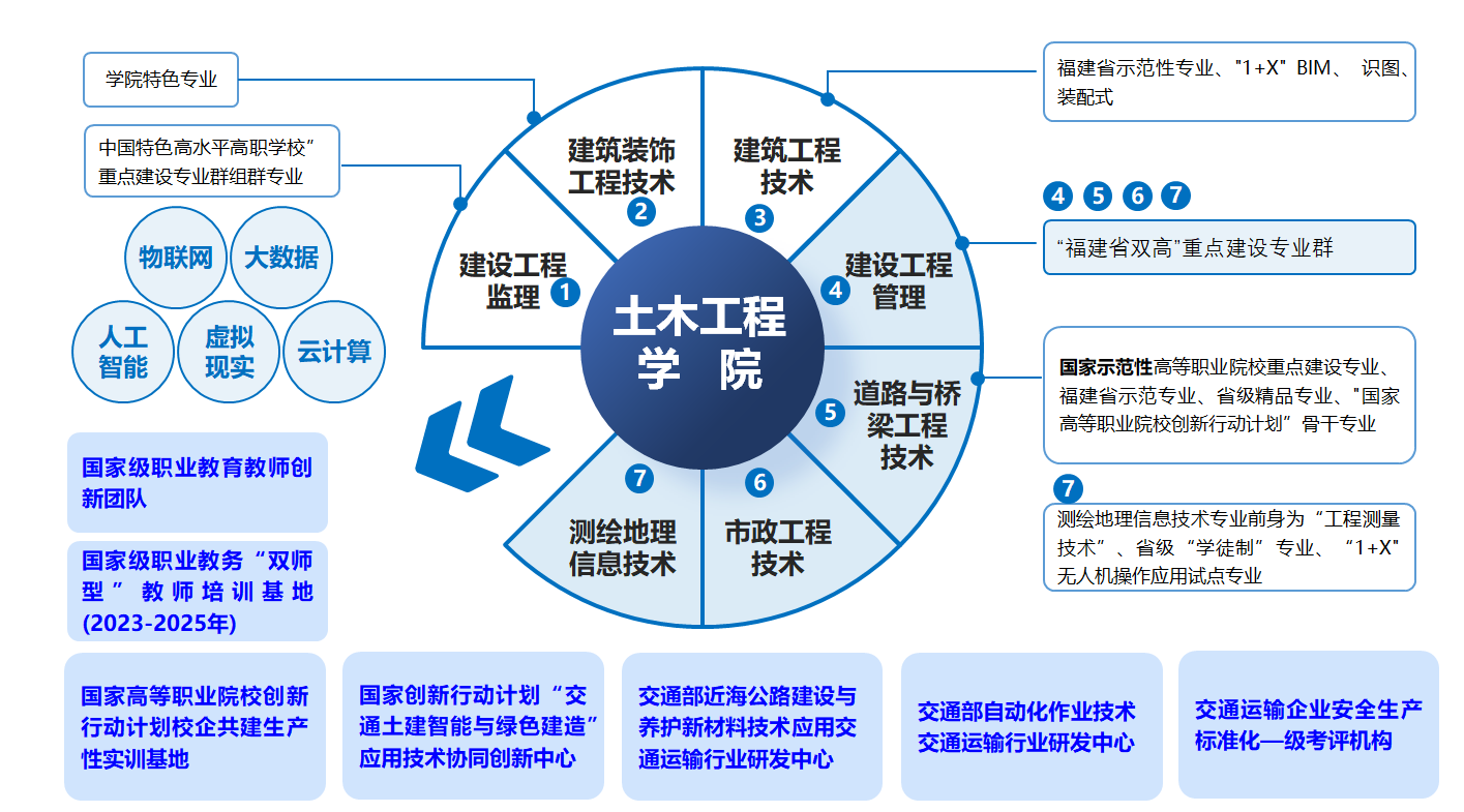 土木工程學(xué)院是全省重要的交通工程建設(shè)與管理高素質(zhì)技術(shù)技能人才培養(yǎng)基地?,F(xiàn)有國家級職業(yè)教育教師創(chuàng)新團(tuán)隊、國家級交通土建智能與綠色建造應(yīng)用技術(shù)協(xié)同創(chuàng)新中心、國家級職業(yè)教育“雙師型”教師培訓(xùn)基地、國家高等職業(yè)院校創(chuàng)新行動計劃校企共建生產(chǎn)性實訓(xùn)基地、交通部自動化作業(yè)技術(shù)交通運輸行業(yè)研發(fā)中心,交通部近海公路建設(shè)與養(yǎng)護(hù)新材料技術(shù)應(yīng)用交通運輸行業(yè)研發(fā)中心,獲交通運輸企業(yè)安全生產(chǎn)標(biāo)準(zhǔn)化一級評價機構(gòu)資質(zhì)。在校生約3500人,自1974年開辦以來,已為行業(yè)輸送超2萬名交通土建類相關(guān)專業(yè)畢業(yè)生,為服務(wù)“交通強國”戰(zhàn)略,加快建設(shè)交通強國福建先行區(qū),推動福建建設(shè)交通強省、構(gòu)建海峽兩岸融合發(fā)展示范區(qū)提供人才支撐。