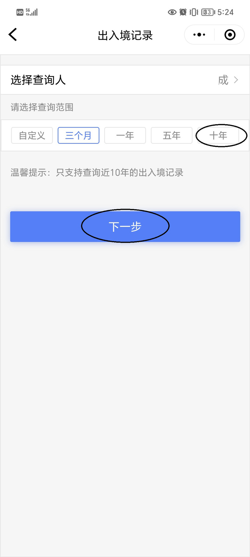 進(jìn)入“出入境記錄查詢”后,可選擇所需查詢時(shí)間段(當(dāng)前支持查詢近10年內(nèi)的出入境記錄),選好后點(diǎn)擊“下一步”,點(diǎn)擊“查詢”,可查到本人的出入境記錄。
