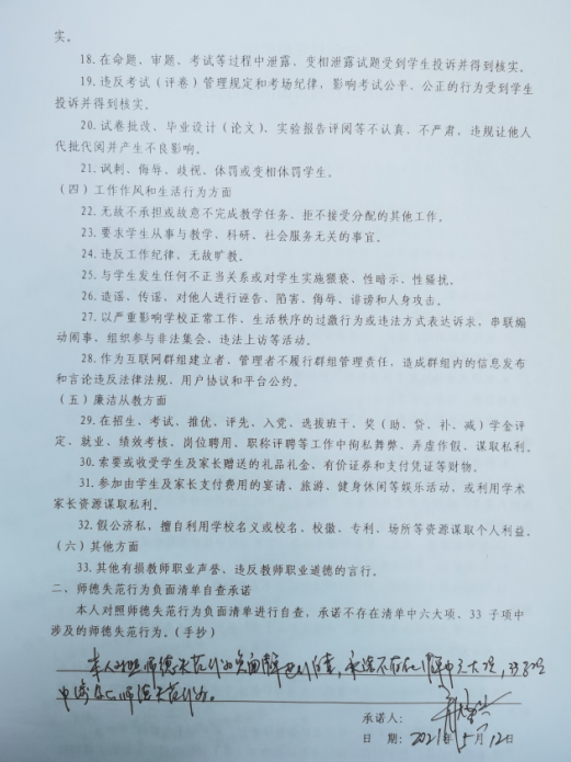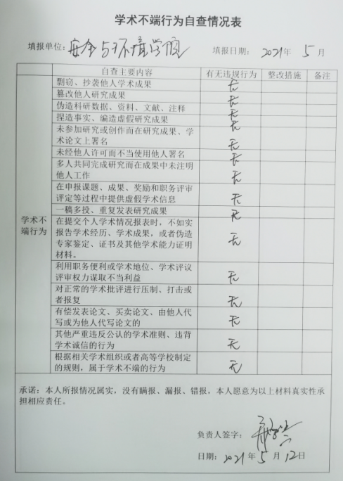 2、開展師風(fēng)師德自查。逐個教師、逐個教研室進(jìn)行徹底排查,落實(shí)每個教職工在思想政治紀(jì)律、學(xué)術(shù)道德、教育教學(xué)、工作作風(fēng)、生活行為、廉潔從教及其他等諸方面是否存在師德失范行為。全體教職工公開表態(tài)承諾,并簽訂《安全與環(huán)境學(xué)院教師師德失范行為負(fù)面清單自查承諾書》和《學(xué)術(shù)不端行為自查情況表》。