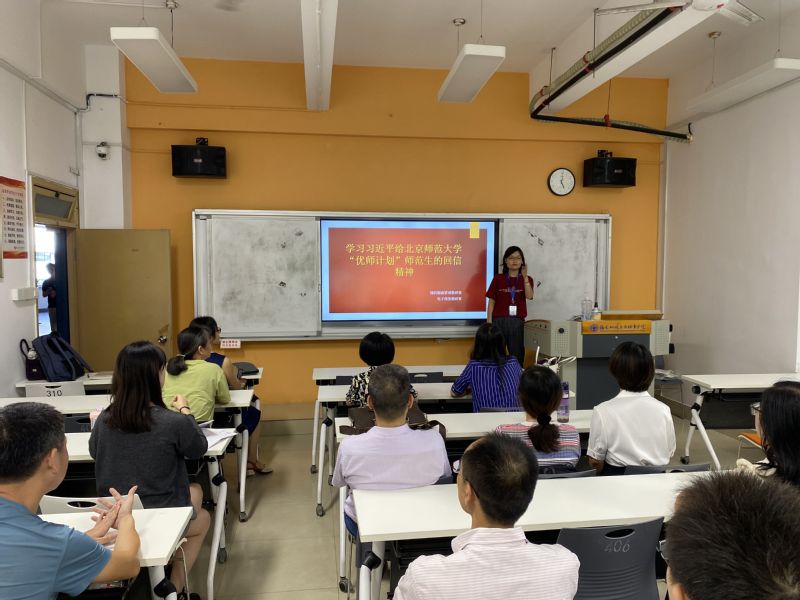 學習會上,俞素平書記帶領全體與會教師學習了習近平總書記給北京師范大學“優(yōu)師計劃”師范生重要回信內容,并觀看了專題片《習近平的教師情》。