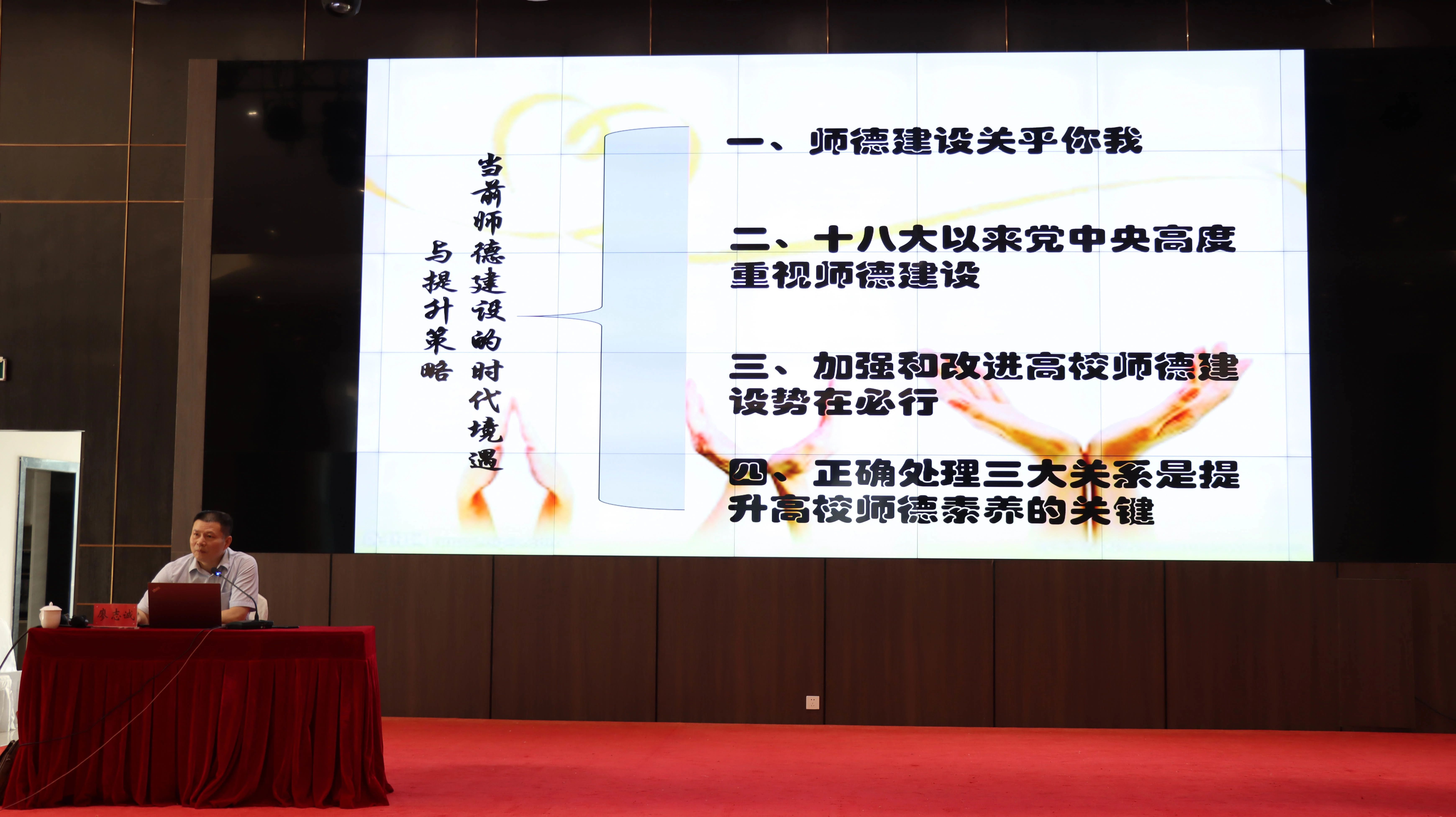師德師風(fēng)是評價(jià)教師隊(duì)伍素質(zhì)的第一標(biāo)準(zhǔn),福建師范大學(xué)馬克思主義學(xué)院教授、法學(xué)博士、碩導(dǎo)、思想政治教育專業(yè)碩士點(diǎn)學(xué)科帶頭人廖志誠以《當(dāng)前師德建設(shè)的時(shí)代境遇與提升策略》為題拉開了本次培訓(xùn)的帷幕,他從師德師風(fēng)建設(shè)的重要性、當(dāng)前師德師風(fēng)存在的主要表現(xiàn)和根源以及如何提升教師師德素養(yǎng)等方面娓娓道來,引導(dǎo)老師們做一個(gè)有理想信念、有道德情操、有扎實(shí)學(xué)識、有仁愛之心的“四有”好老師。