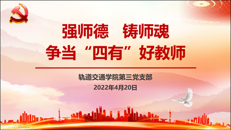為全面落實(shí)新時(shí)代黨的教育方針,堅(jiān)持立德樹人初心,夯實(shí)為黨育人、為國育才的根基,建立健全師德師風(fēng)建設(shè)長效機(jī)制,2022年4月20日下午,軌道交通學(xué)院第三黨支部開展“強(qiáng)師德 鑄師魂 爭當(dāng)‘四有’好教師”主題黨日活動(dòng)。