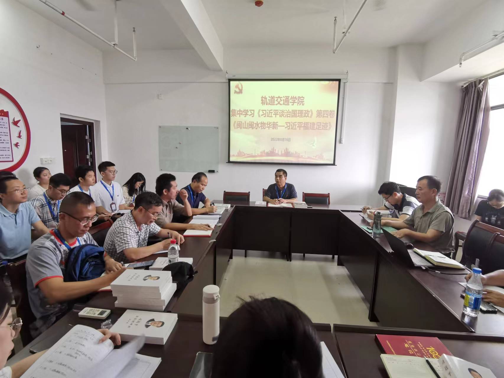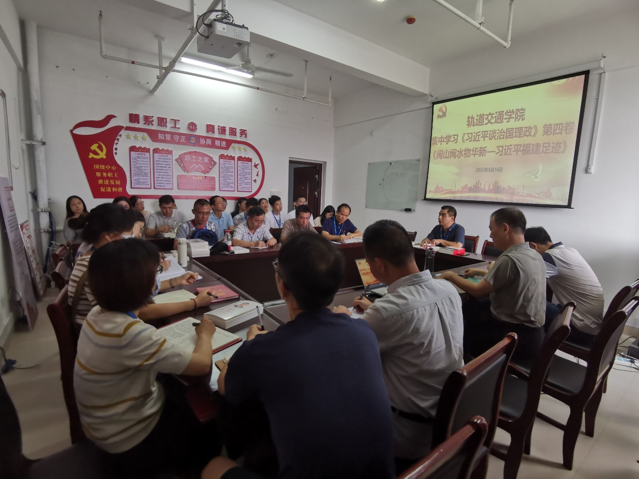 2022年8月16日上午,軌道交通學(xué)院在第一會(huì)議室舉行專題學(xué)習(xí)會(huì),采取自學(xué)、研討、觀看視頻等相結(jié)合的方式集中學(xué)習(xí)《習(xí)近平談治國理政》第四卷和《閩山閩水物華新——習(xí)近平福建足跡》。軌道交通學(xué)院全院教職工參加學(xué)習(xí)會(huì),會(huì)議由學(xué)院黨總支書記孫基主持。