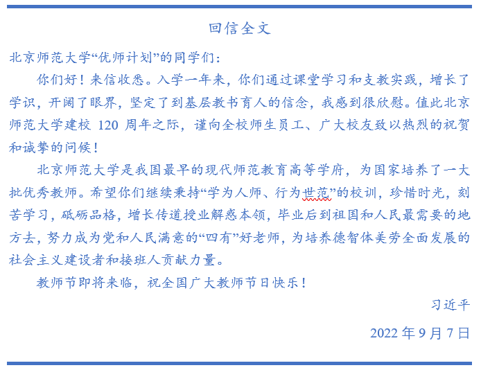 在第38個教師節(jié)前夕,在黨的二十大即將召開的重要時刻,中共中央總書記、國家主席、中央軍委主席習(xí)近平給北京師范大學(xué)“優(yōu)師計劃”師范生回信,對他們寄予殷切期望,并向全國廣大教師致以節(jié)日的祝福。