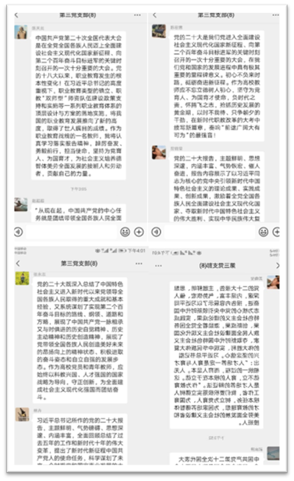 支部副書記陳宏意:黨的二十大在我們黨和國家的發(fā)展進(jìn)程中具有極其重要的里程碑意義。初心不負(fù)來時(shí)路,砥礪奮進(jìn)新征程。作為高校教師應(yīng)不忘立德樹人初心,堅(jiān)守為黨育人、為國育才使命,負(fù)時(shí)代之責(zé),懷騰飛之志,搶抓歷史發(fā)展的黃金期,以時(shí)不我待、只爭朝夕的干勁,在新時(shí)代職教改革的大考中續(xù)寫新篇章,奏響“前途廣闊大有可為”的最強(qiáng)音!