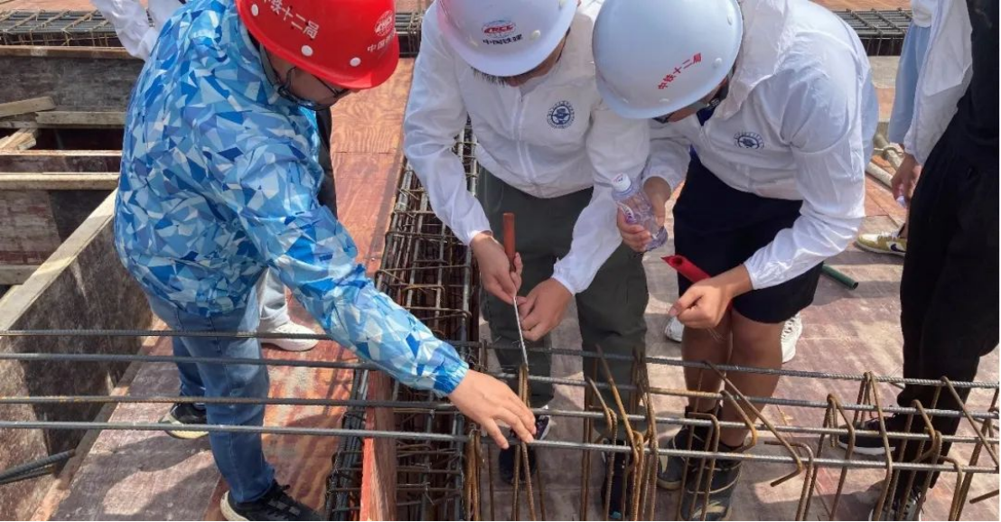 實踐團在施工人員的的帶領下,觀摩施工現(xiàn)場。項目正在進行地上第二層梁結(jié)構(gòu)的鋼筋工程施工,施工人員向?qū)嵺`團介紹了鋼筋工程現(xiàn)場施工的質(zhì)量控制要點,示范并指導實踐團同學進行了梁箍筋的綁扎。通過現(xiàn)場觀摩、動手、實踐,達到知行合一。