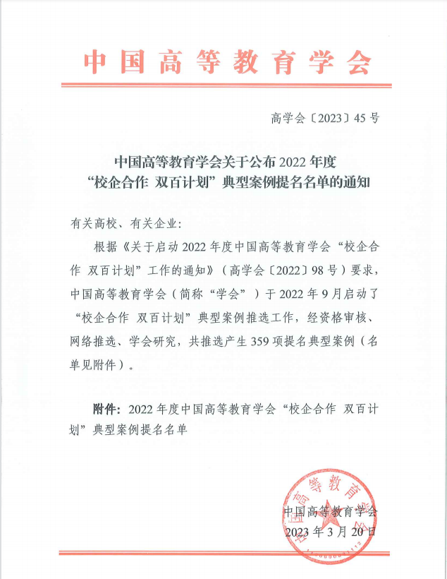 自2022年9月中國高等教育學會啟動此項評選工作以來,學院高度重視,組織開展申報和選送工作。為了確保推薦質(zhì)量,邀請校外專家對參選的案例進行全面的指導和完善,最終經(jīng)資格審核、網(wǎng)絡(luò)推選、學會研究等環(huán)節(jié),收獲一項提名的好成績。