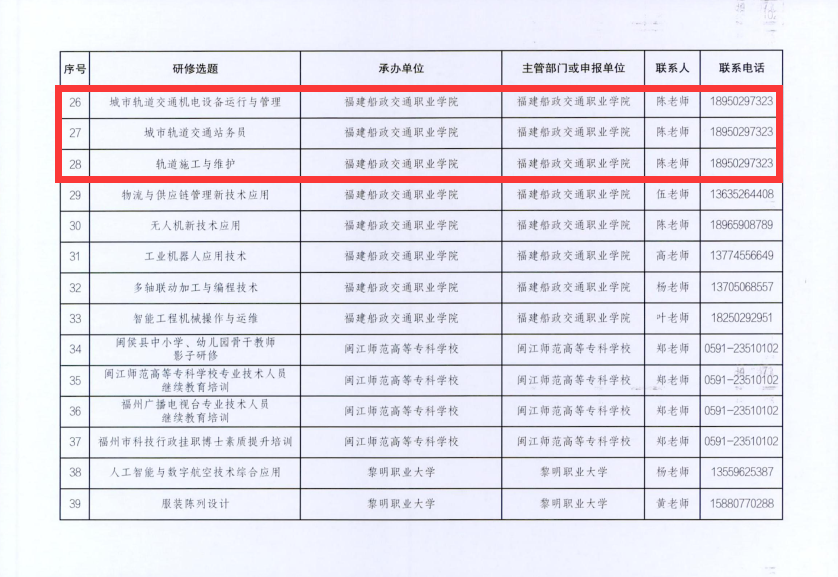 近日,福建省人力資源和社會保障廳辦公室發(fā)布了《關(guān)于做好專業(yè)技術(shù)人才知識更新工程2023年高級研修項目實施工作的通知》(閩人社辦〔2023〕94號)公布了2023年全省專業(yè)技術(shù)人才知識更新工程高級研修項目計劃。我院申報的《城市軌道交通機(jī)電設(shè)備運(yùn)行與管理》等3個項目成功獲批省級項目。