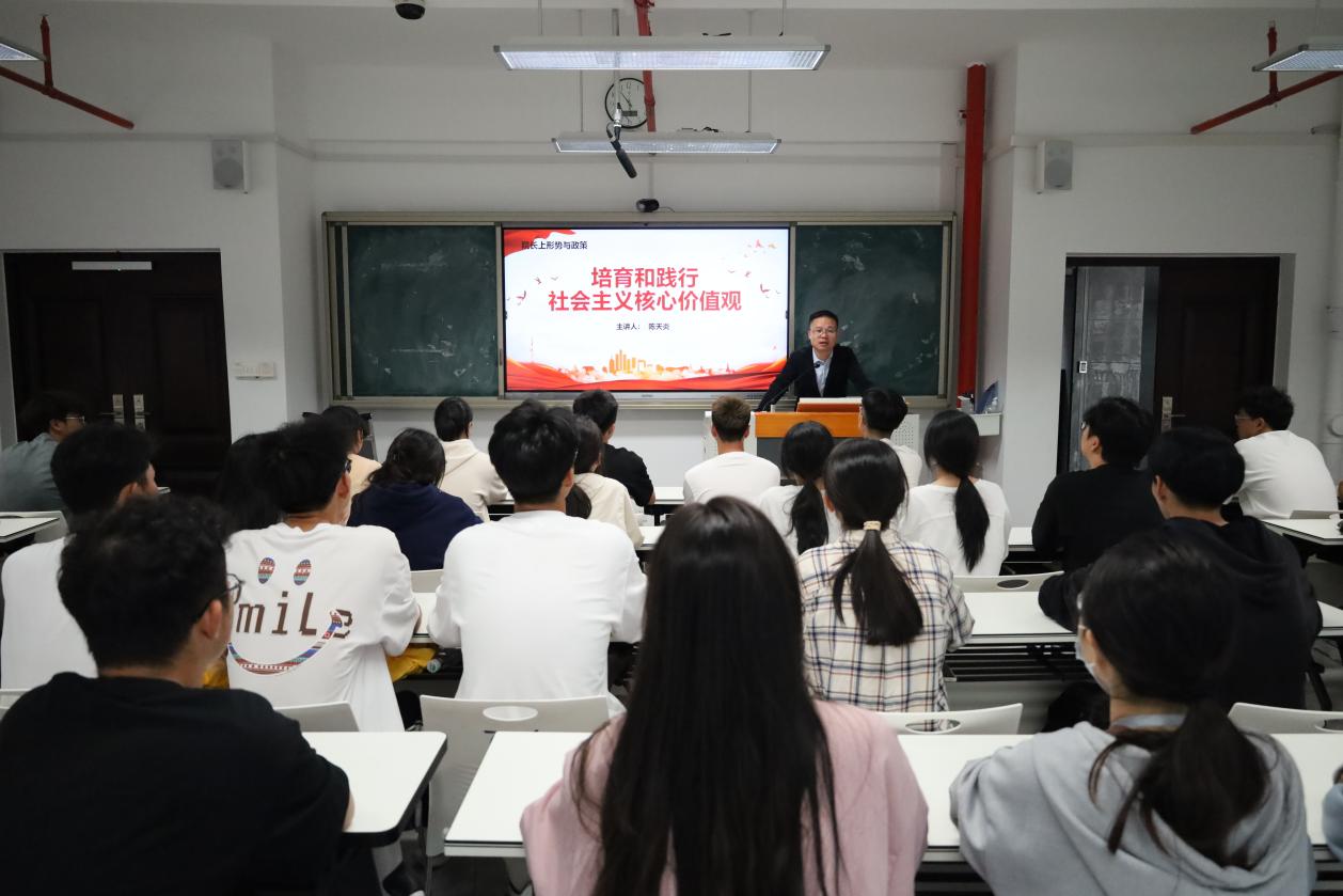 為深入學(xué)習(xí)宣傳貫徹習(xí)近平新時代中國特色社會主義思想,加深學(xué)生對社會主義核心價值觀的理解,2022年5月13日軌道交通學(xué)院院長陳天炎以“培育和踐行社會主義核心價值觀”為主題講授了一堂形勢與政策課程。