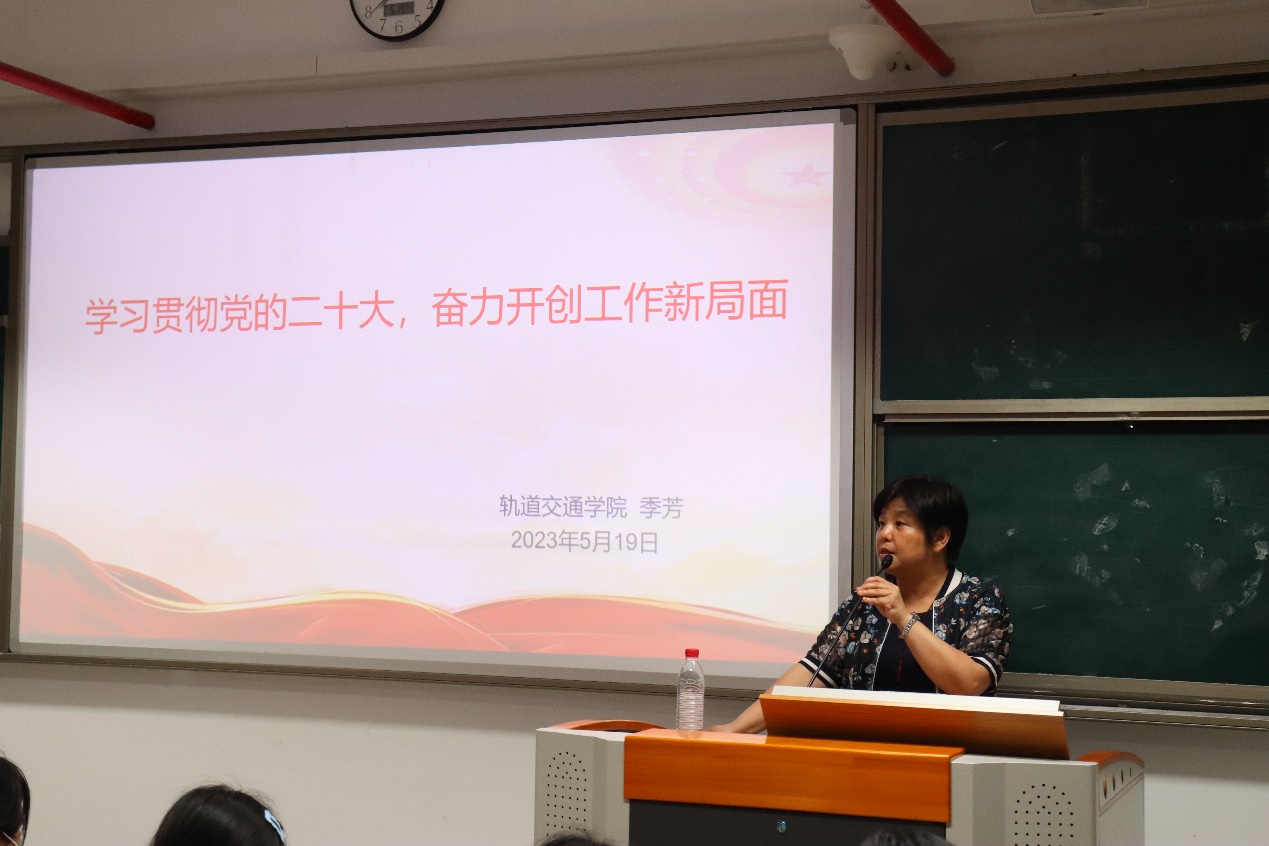 為深入貫徹落實(shí)習(xí)近平總書記關(guān)于“全面學(xué)習(xí)、全面把握、全面落實(shí)”的重要指示要求,持續(xù)推動(dòng)學(xué)習(xí)落實(shí)黨的二十大精神往深里走、往實(shí)里走、往心里走,軌道交通學(xué)院副院長(zhǎng)季芳于2023年5月19日開展“學(xué)習(xí)貫徹黨的二十大,奮力開創(chuàng)工作新局面”主題宣講會(huì)。