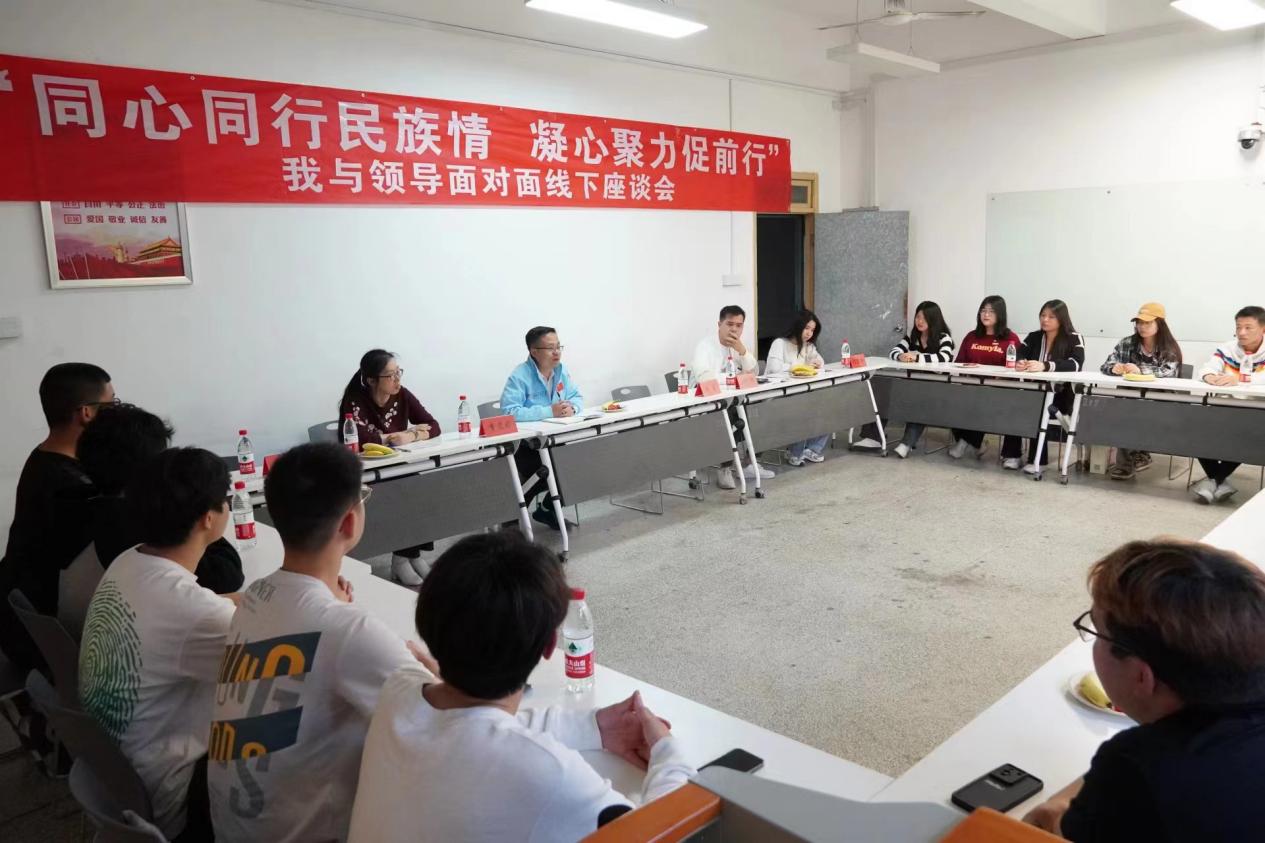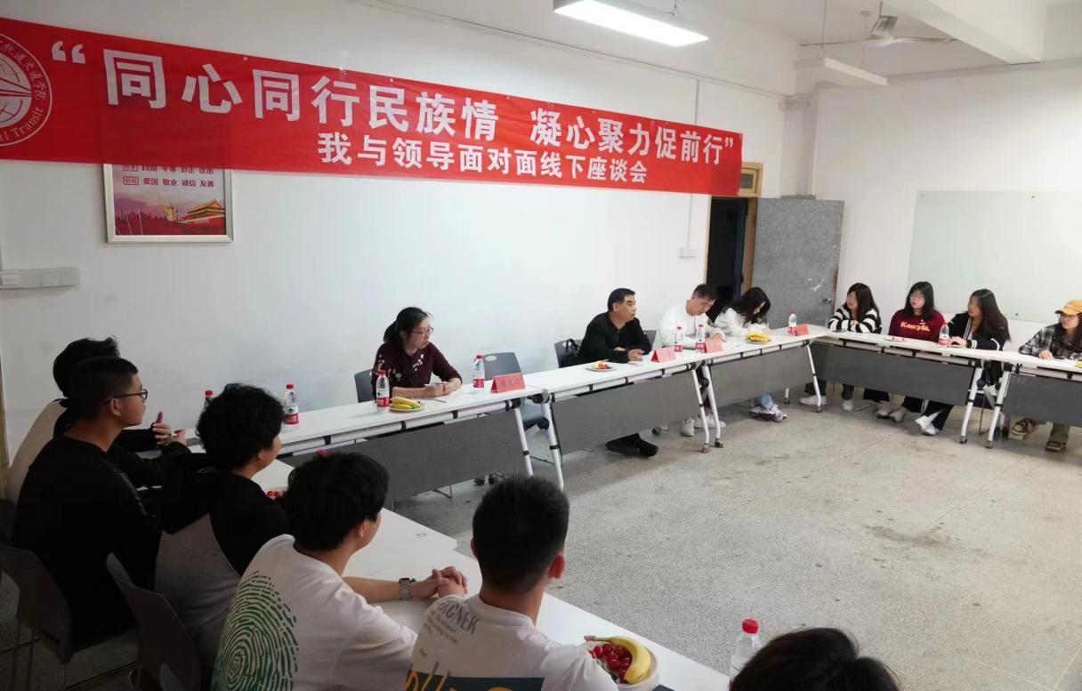 習(xí)近平總書記指出:“鑄牢中華民族共同體意識是新時代黨的民族工作的主線,也是民族地區(qū)各項(xiàng)工作的主線。要把鑄牢中華民族共同體意識工作抓實(shí)?!毙抡鞒躺希仨毶钊雽W(xué)習(xí)貫徹習(xí)近平總書記關(guān)于加強(qiáng)和改進(jìn)民族工作的重要思想,將鑄牢中華民族共同體意識作為一項(xiàng)系統(tǒng)工程抓實(shí)抓細(xì)。2023年11月22日,軌道交通學(xué)院開展“同心同行民族情,凝心聚力促前行”我和領(lǐng)導(dǎo)面對面線下座談會。參加本次座談會的有軌道交通學(xué)院黨總支書記孫基,院長陳天炎,輔導(dǎo)員李雯婷、鄭華輝、陳凌靜以及各少數(shù)民族的同學(xué)們。
