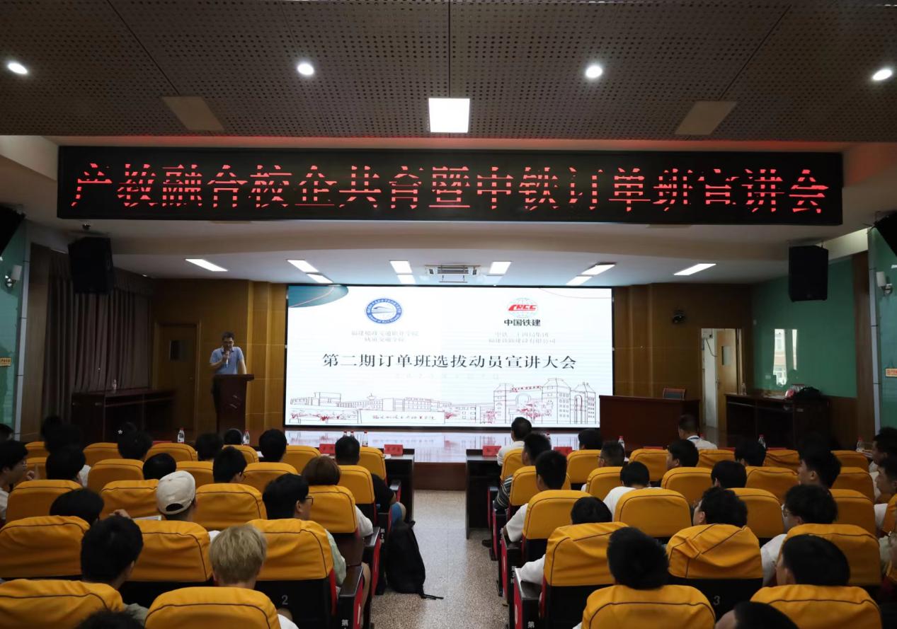 為了更進(jìn)一步地深化交通合作,拓寬我校畢業(yè)生的就業(yè)渠道,6月3日,福建船政交通職業(yè)學(xué)院軌道交通學(xué)院于行政樓6樓會議室順利召開了產(chǎn)教融合校企共育暨訂單班宣講會。共建單位中鐵二十四局集團(tuán)福建鐵路建設(shè)有限公司蔡許昌部長、王燁副部長、陳熙副部長、鄭耕心副部長、張莉科長,軌道交通學(xué)院黨總支書記孫基、副院長季芳、工程技術(shù)教研室主任王春茶及2021級全體師生出席此次大會,陳宏意副院長擔(dān)任主持。