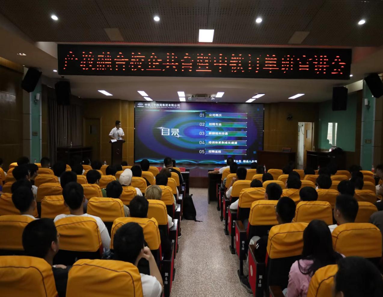 大會伊始,軌道交通學(xué)院黨總支書記孫基與中鐵二十四局集團(tuán)福建鐵路建設(shè)有限公司蔡許昌部長為本次宣講會致辭。詳細(xì)介紹了中鐵二十四局集團(tuán)福建鐵路建設(shè)有限公司及雙方合作歷程,強(qiáng)調(diào)了訂單班內(nèi)容和意義。中鐵二十四局集團(tuán)福建鐵路建設(shè)有限公司作為我院的長期合作伙伴,有著完善的培訓(xùn)體系和富有競爭力的薪酬福利待遇,吸引著同學(xué)們積極參與到宣講會中來。