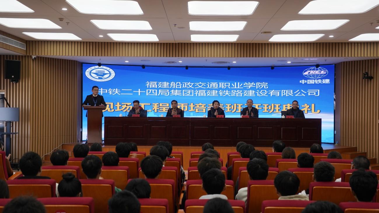 為進(jìn)一步貫徹落實(shí)《教育部辦公廳等五部門關(guān)于實(shí)施職業(yè)教育現(xiàn)場工程師專項(xiàng)培養(yǎng)計(jì)劃的通知》文件精神,加快培養(yǎng)更多適應(yīng)新技術(shù)、新業(yè)態(tài)、新模式的高素質(zhì)技術(shù)技能人才,2025年1月2日下午,由福建船政交通職業(yè)學(xué)院主辦的中鐵二十四局集團(tuán)福建鐵路建設(shè)有限公司現(xiàn)場工程師培養(yǎng)班開班典禮在福建船政交通職業(yè)學(xué)院順利舉行。福建船政交通職業(yè)學(xué)院黨委副書記張輝、中鐵二十四局集團(tuán)福建公司副總經(jīng)理(兼總工程師)林劍忠、黨委干部部(人力資源部)副部長王燁、軌道交通學(xué)院黨政領(lǐng)導(dǎo)、項(xiàng)目有關(guān)教師和現(xiàn)場工程師班全體學(xué)員出席典禮,開班典禮由軌道交通學(xué)院副院長主持。