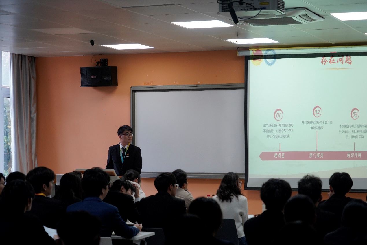 軌道交通學院學生會學習部第一負責人衛(wèi)楠林,總結了本學期對學習學風的建設,不足之處以及未來規(guī)劃進行講述,在座的導員也對部門的不足進行指出,提建議,同時也期待未來的發(fā)展。