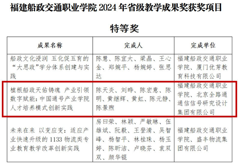 近日,2024年福建省教學成果獎評選結果公布,我院陳天炎教授領銜申報的《植根船政天佑鑄魂 產業(yè)引領數字賦能:中國通號產業(yè)學院人才培養(yǎng)模式創(chuàng)新實踐》榮獲職業(yè)教育省級教學成果獎特等獎。