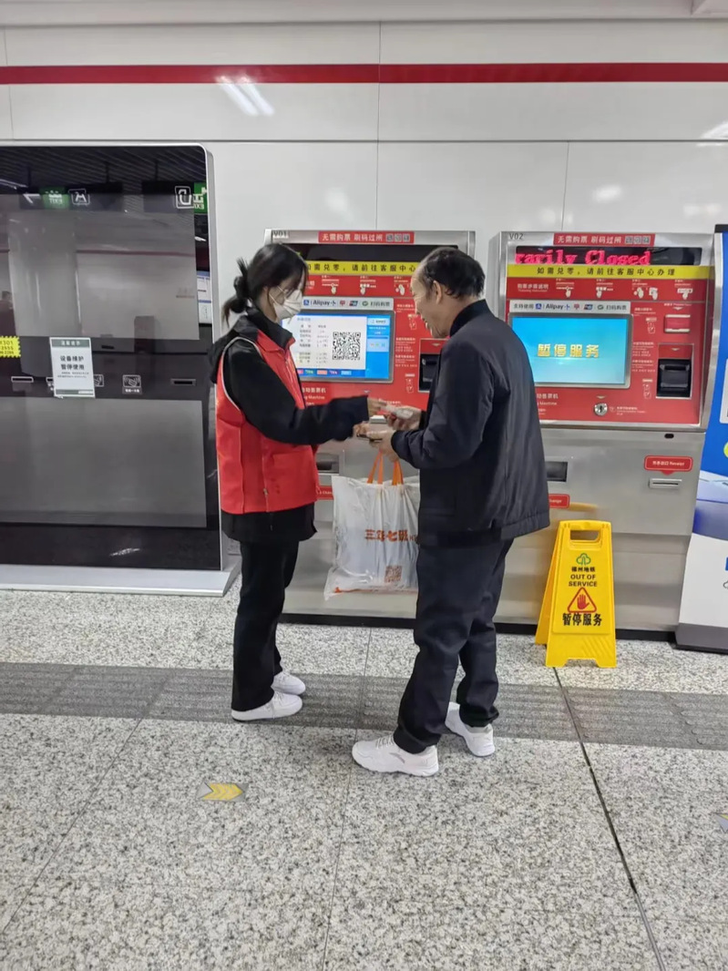 志愿者們幫助不熟悉購票流程的旅客進(jìn)行購票指引,并為他們規(guī)劃路線,普及相關(guān)的地鐵知識(shí)。
