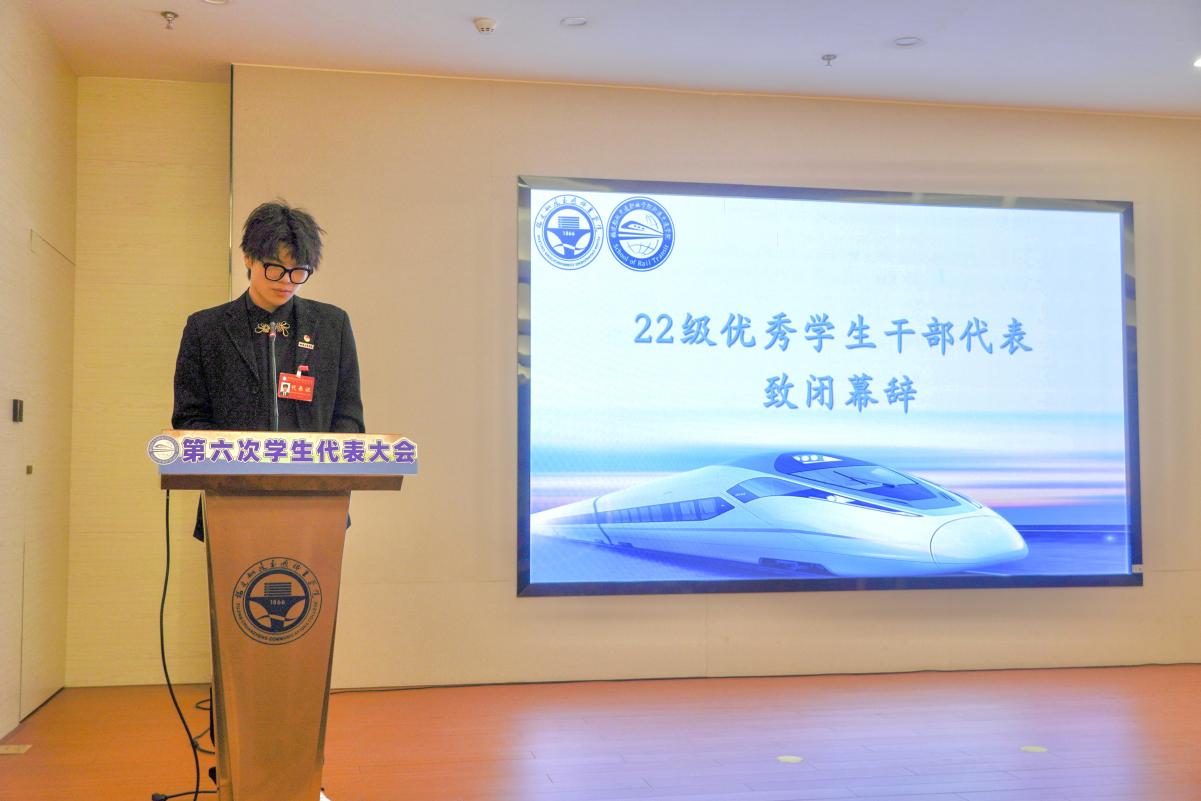 22級優(yōu)秀學(xué)生干部金卓裕致閉幕詞,向新當(dāng)選的主席團(tuán)成員表示祝賀,向全體工作人員的辛勤付出致謝。顧過去一年學(xué)生會工作,思考規(guī)劃未來發(fā)展方向。展現(xiàn)軌道交通學(xué)院嚴(yán)謹(jǐn)求實、積極進(jìn)取的精神風(fēng)貌。他強(qiáng)調(diào):“新一屆學(xué)生會要以此次大會為起點,把青春奮斗融入學(xué)院發(fā)展大局,讓每個活動都有溫度,每項服務(wù)都有力度?!焙粲鯏y手共進(jìn),以飽滿熱情、堅定信念、務(wù)實行動團(tuán)結(jié)帶領(lǐng)同學(xué),在實現(xiàn)中國夢實踐中放飛夢想、書寫人生華章。祝愿新一屆學(xué)生會團(tuán)結(jié)一心、再創(chuàng)佳績。