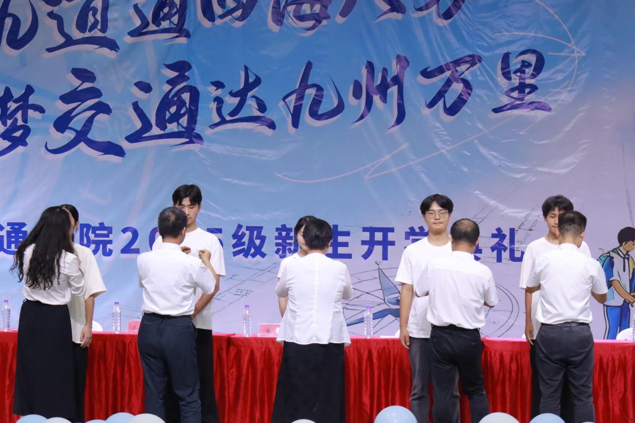 典禮現(xiàn)場最動人的環(huán)節(jié)到來。學院領導與教師代表們手持徽,逐一為新生佩戴。當小小的徽別在胸前,不僅是身份的象征,更承載著“傳承船政精神、深耕軌道事業(yè)”的期許。新生們輕輕撫摸徽章,眼中滿是激動與堅定——從這一刻起,他們正式以“船政人”的身份,開啟逐夢之旅。