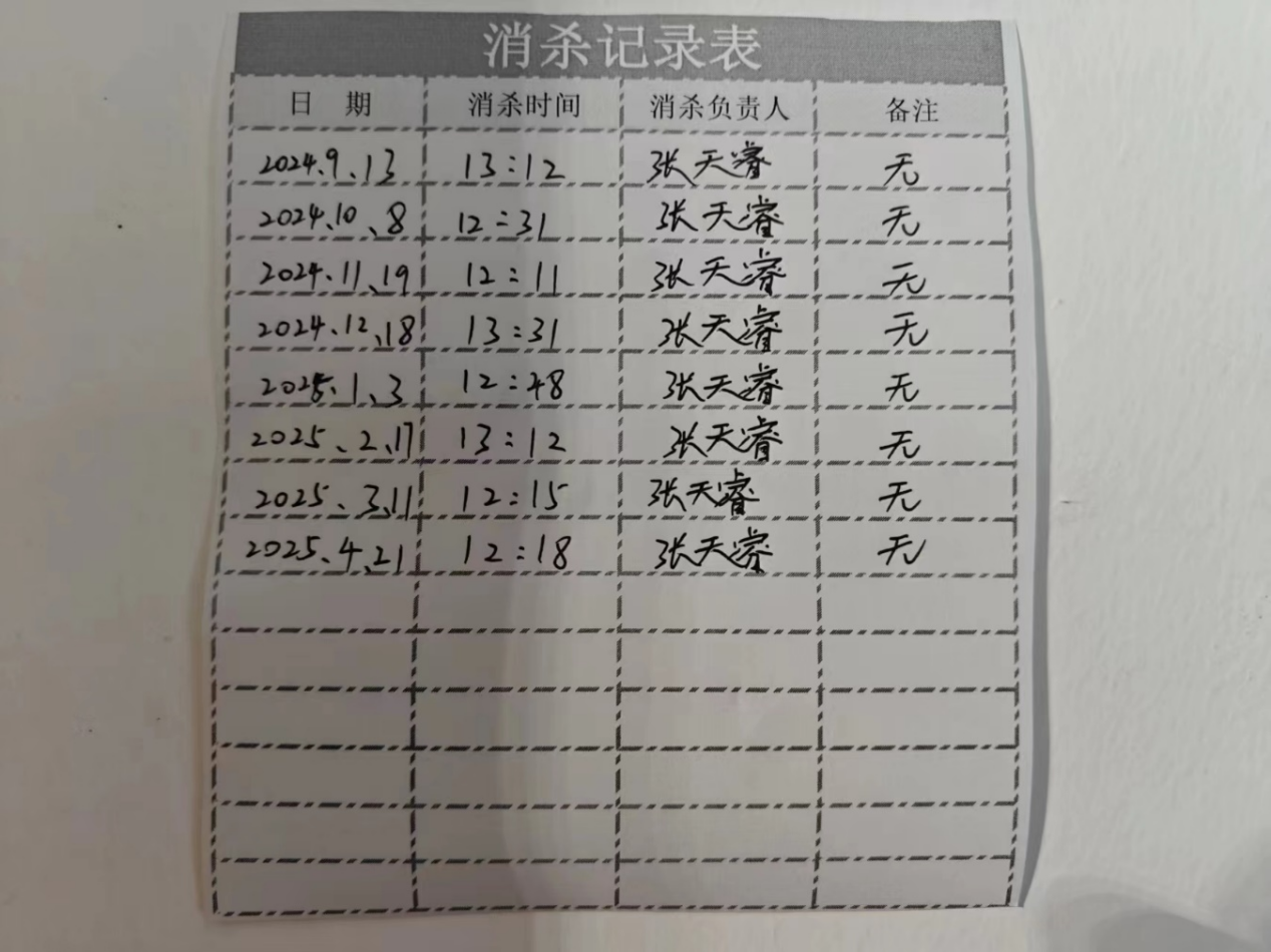 每次消殺完成后,志愿者們都會認真填寫詳細的記錄表,注明消殺日期、責(zé)任人、消毒劑濃度和作業(yè)時間。這些記錄表被張貼在每臺洗衣機旁的醒目位置,同學(xué)們可以隨時查看,了解最新消殺情況。這種開放式管理贏得了同學(xué)們的信任,也讓服務(wù)過程始終處于監(jiān)督之下。