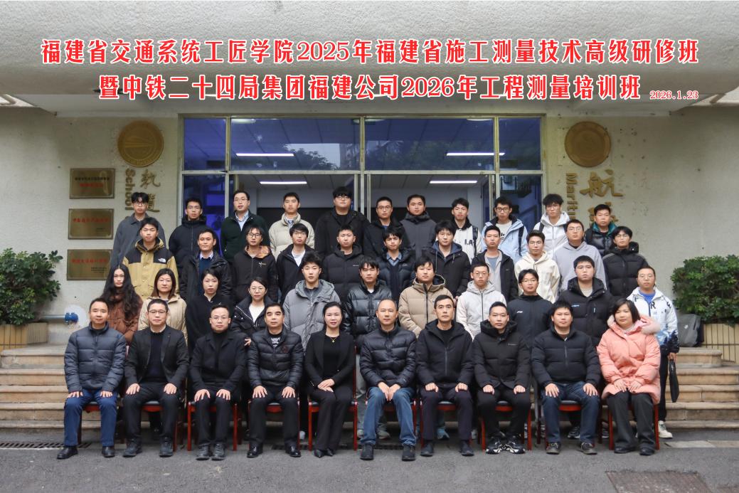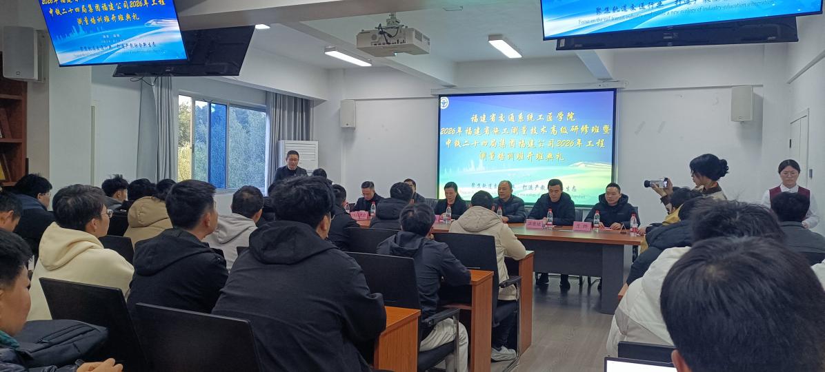 2026年1月23日上午,由福建船政交通職業(yè)學院軌道交通學院承辦的“福建省交通系統(tǒng)工匠學院2025年福建省施工測量技術(shù)高級研修班暨中鐵二十四局集團福建公司2026年工程測量培訓班”在福建船政交通職業(yè)學院校友樓軌道學院三樓會議室順利開班。中鐵二十四局集團福建公司總工程師林劍忠、工程管理部部長洪淮斌、黨委干部部副部長王燁、測繪中心主任曾志鑫,學校工會常務(wù)副主席、福建省交通系統(tǒng)工匠學院副院長王雪梅、軌道交通學院黨政領(lǐng)導(dǎo)、中鐵二十四局集團福建公司全體培訓學員、軌道交通學院教師代表及工作人員參加儀式。開班儀式由軌道交通學院副院長陳宏意主持。