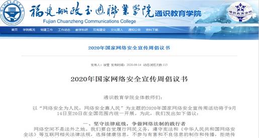 根據(jù)學(xué)校宣傳統(tǒng)戰(zhàn)部《關(guān)于開(kāi)展國(guó)家網(wǎng)絡(luò)安全宣傳周活動(dòng)的通知》要求,我院圍繞“網(wǎng)絡(luò)安全為人民,網(wǎng)絡(luò)安全靠人民”開(kāi)展了2020年國(guó)家網(wǎng)絡(luò)安全宣傳周活動(dòng)。