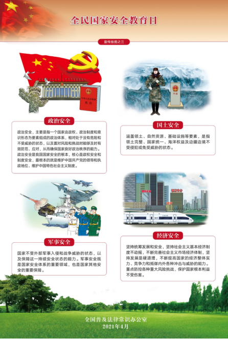 什么是全民國家安全教育日? 全民國家安全教育日(National Security Education Day),是為了增強全民國家安全意識,維護國家安全而設立的節(jié)日。2015年7月1日,全國人大常委會通過的《中華人民共和國國家安全法》第十四條規(guī)定,每年4月15日為全民國家安全教育日。 什么是國家安全? 根據(jù)《國家安全法》第二條規(guī)定: 國家安全是指國家政權、主權、統(tǒng)一和領土完整、人民福祉、經濟社會可持續(xù)發(fā)展和國家其他重大利益相對處于沒有危險和不受內外威脅的狀態(tài),以及保障持續(xù)安全狀態(tài)的能力。 什么是堅持總體國家安全觀 2014年4月15日,習近平總書記在中央國家安全委員會第一次全體會議上提出,堅持總體國家安全觀,走出一條中國特色國家安全道路。首次提出總體國家安全觀重大戰(zhàn)略思想。這是以習近平同志為核心的黨中央對國家安全理論的重大創(chuàng)新,是新形勢下維護和塑造中國特色國家安全的行動指南,具有重大的理論意義、時代意義、實踐意義。 總體國家安全觀的五大要素 1.以人民安全為宗旨 2.以政治安全為根本 3.以經濟安全為基礎 4.以軍事、文化、社會安全為保障 5.以促進國際安全為依託 貫徹落實總體國家安全觀,做到十個重視(五對關系) 1.既重視外部安全、又重視內部安全 2.既重視國土安全、又重視國民安全 3.既重視傳統(tǒng)安全、又重視非傳統(tǒng)安全 4.既重視發(fā)展問題、又重視安全問題 5.既重視自身安全、又重視共同安全