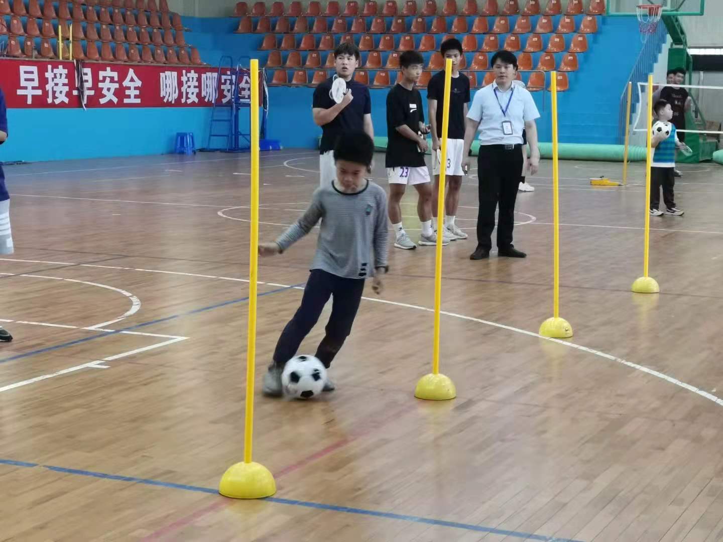 在運球繞桿射門活動中,通識教育學(xué)院教師王發(fā)振和學(xué)校足球俱樂部學(xué)生對兒童開展愛國主義教育,并耐心指導(dǎo)兒童運球繞桿和射門技巧,提高兒童的競爭意識,培養(yǎng)球感、協(xié)調(diào)性、靈敏性以及對足球運動的興趣。
