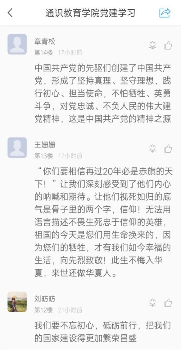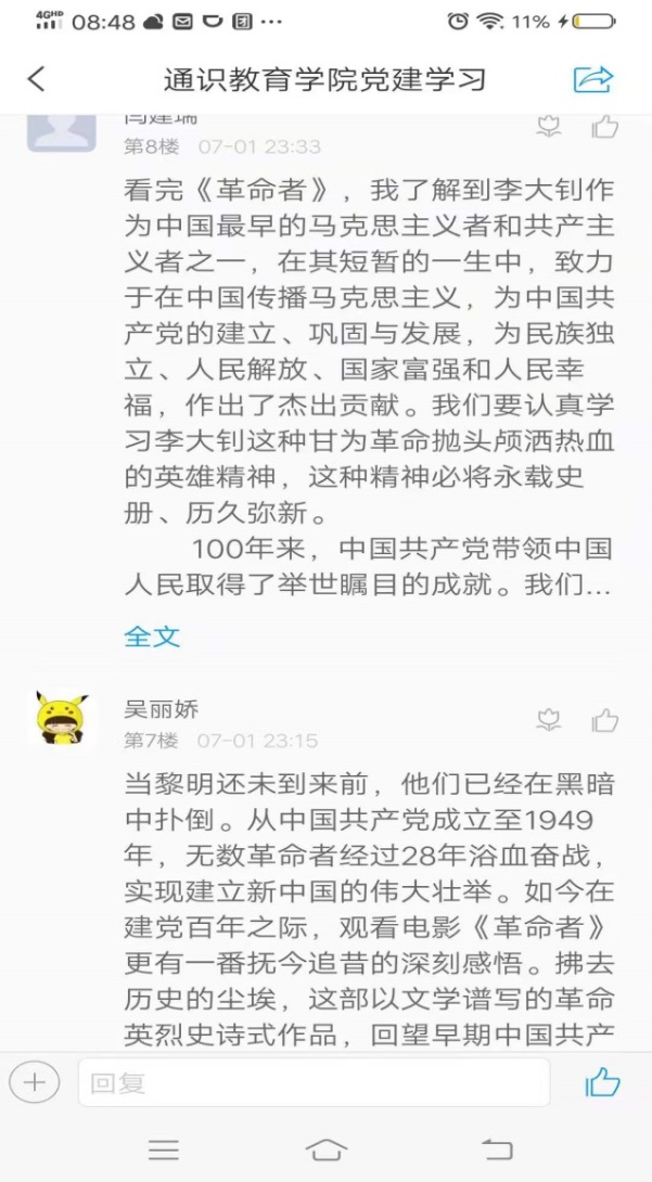 歷史川流不息,精神代代相傳。在觀影結(jié)束后各黨員通過(guò)“學(xué)習(xí)通”-“通識(shí)教育學(xué)院黨總支”-“討論”-“觀看黨建電影《革命者》,撰寫(xiě)心得體會(huì)”,通過(guò)觀看紅色電影《革命者》,師生黨員深刻感受到中國(guó)共產(chǎn)黨先驅(qū)們偉大的建黨精神,在奮斗中堅(jiān)持真理、堅(jiān)守理想,踐行初心、擔(dān)當(dāng)使命,不怕?tīng)奚⒂⒂露窢?zhēng),對(duì)黨忠誠(chéng)、不負(fù)人民,大家紛紛表示要繼續(xù)弘揚(yáng)光榮傳統(tǒng)、賡續(xù)紅色血脈,永遠(yuǎn)把偉大建黨精神繼承下去、發(fā)揚(yáng)光大。