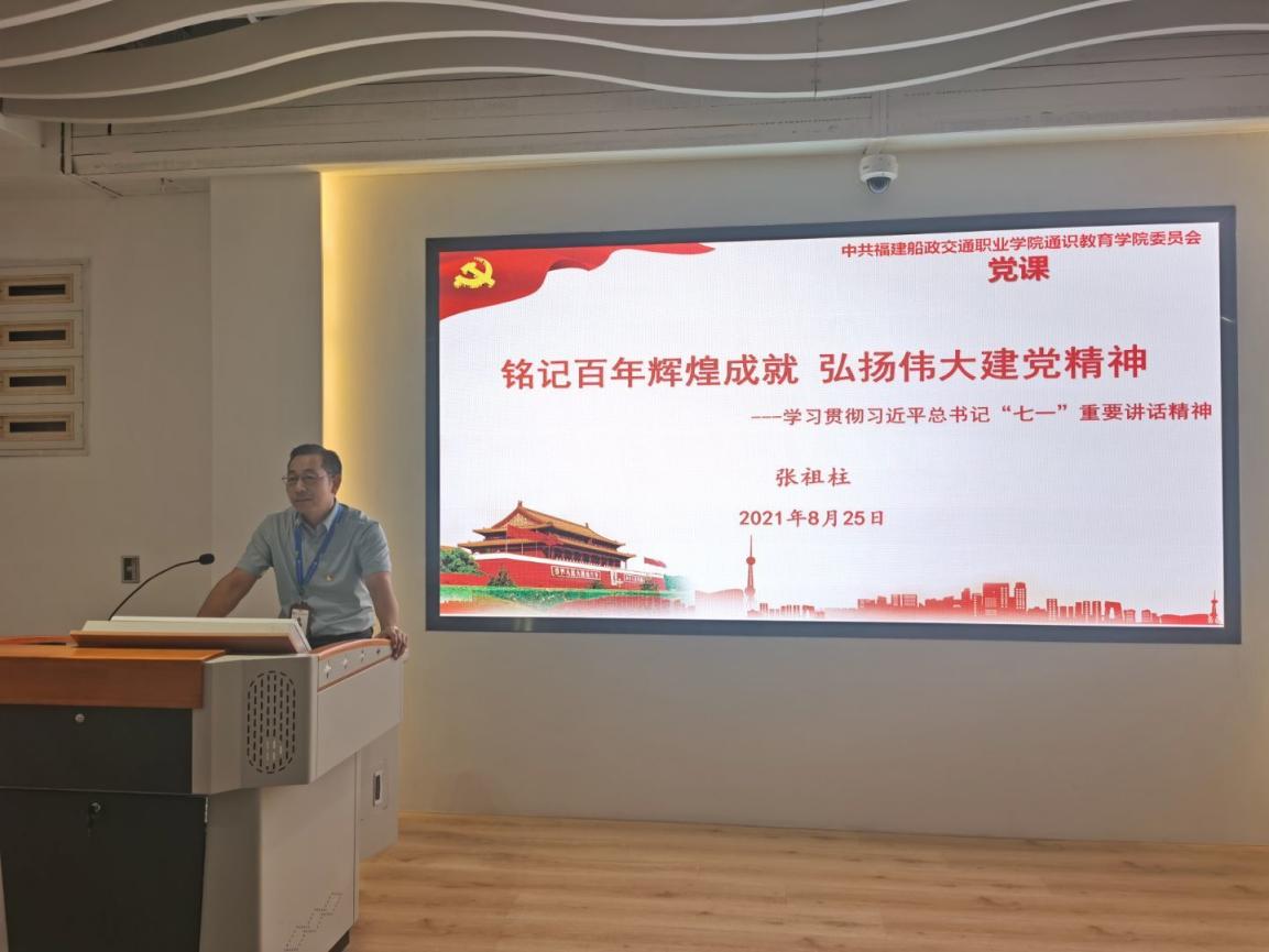 為深入學(xué)習(xí)貫徹習(xí)近平總書記在黨史學(xué)習(xí)教育動(dòng)員大會(huì)、習(xí)近平總書記在慶祝中國共產(chǎn)黨成立100周年大會(huì)上的重要講話和來閩考察時(shí)重要講話指示精神,扎實(shí)推進(jìn)黨史學(xué)習(xí)教育走深走實(shí),8月25日上午,學(xué)院黨委委員、副院長張祖柱在學(xué)院黨建·思政·船政文化研學(xué)中心作題為《銘記百年輝煌成就,弘揚(yáng)偉大建黨精神》黨史學(xué)習(xí)教育專題黨課,通識(shí)教育學(xué)院黨總支全體黨員參加。