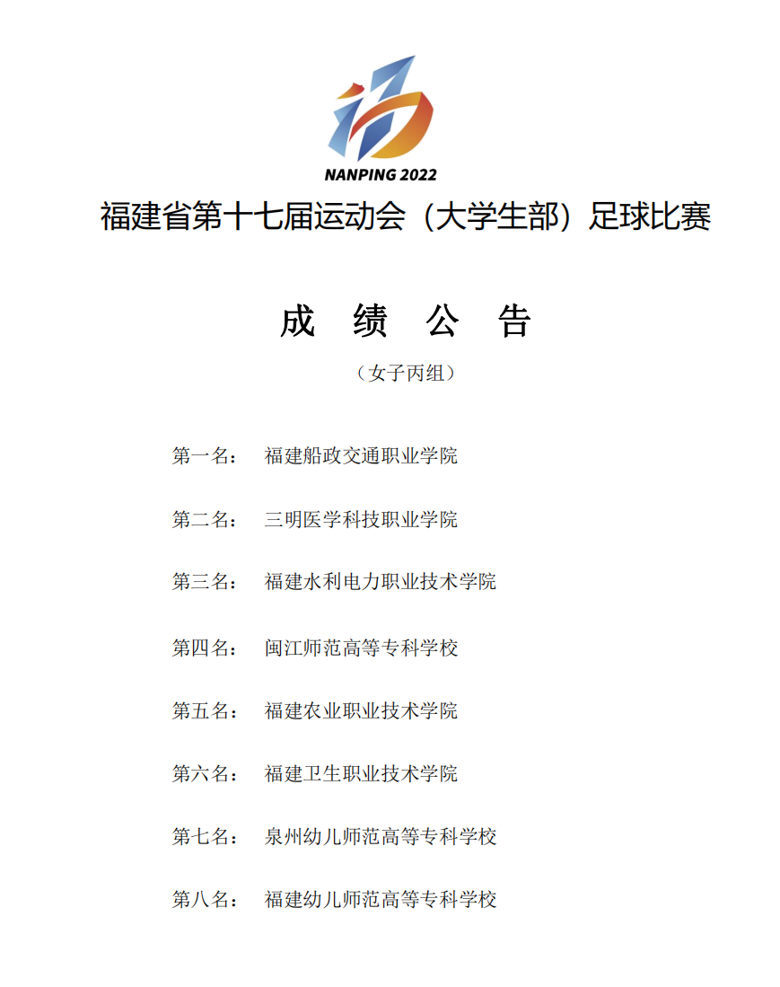 7月20日晚,福建省第十七屆運(yùn)動(dòng)會(huì)(大學(xué)生部女子丙組)足球比賽在福建省青少年校園足球基地、福建船政交通職業(yè)學(xué)院圓滿落幕,該組別共有來(lái)自全省8支高職院校代表隊(duì)參賽。