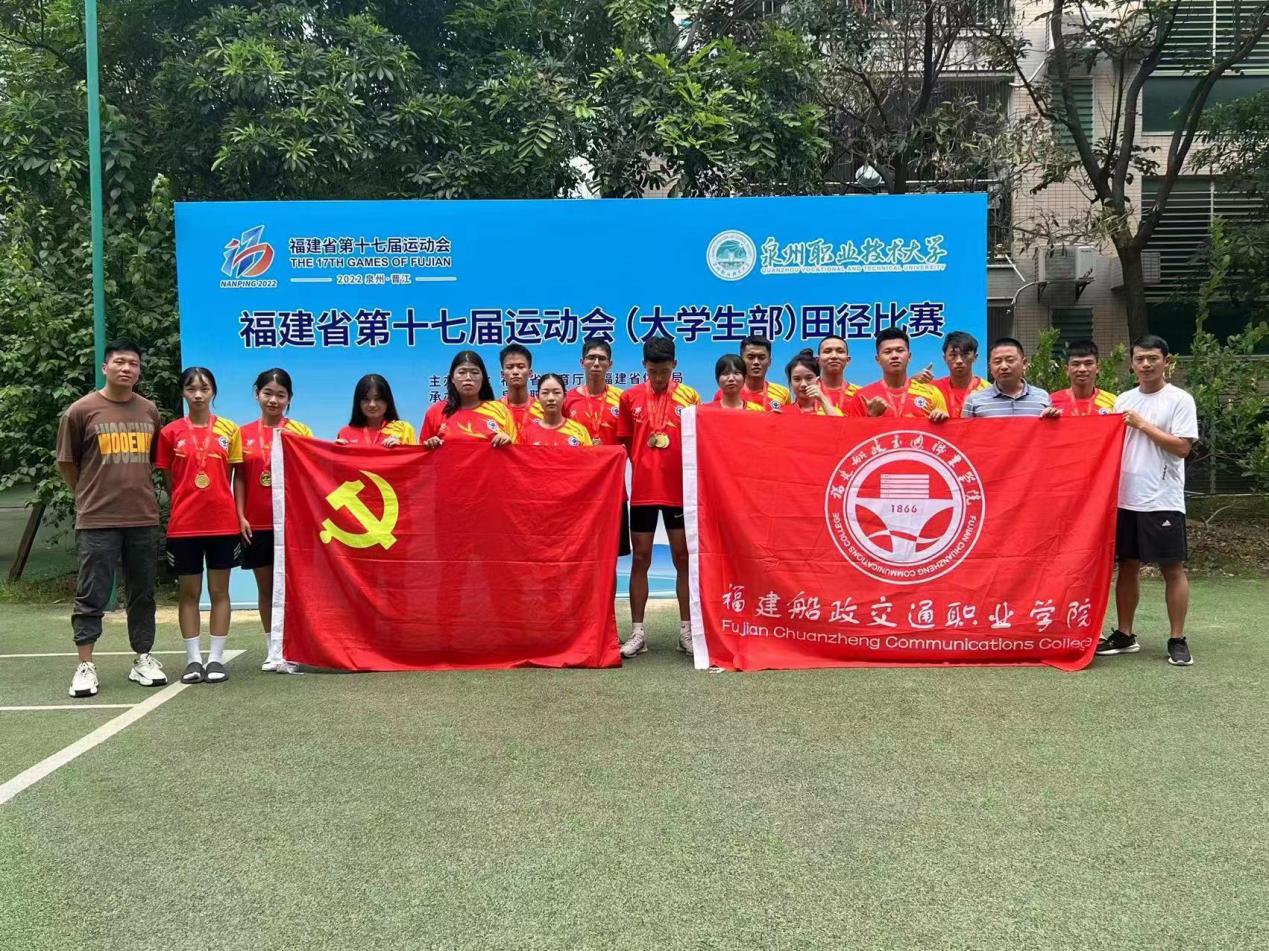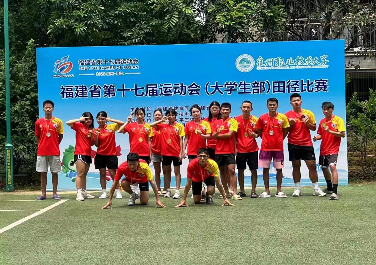 2022年7月31日——8月7日,福建省第十七屆運動會(大學生部)田徑比賽在泉州職業(yè)技術大學順利舉辦。此次比賽由福建省教育廳、福建省體育局主辦,共吸引來自省內80多所高校的1500多位運動健兒參賽。經過激烈角逐,我院田徑隊分別在丙組男子100米、200米、跳高、跳遠、800米、鐵餅、1500米和5000米,女子100米、鉛球、鐵餅等項目斬金奪銀,以10金3銀3銅,改寫5項賽會記錄,以222分的優(yōu)異成績榮獲丙組團體總分第一。