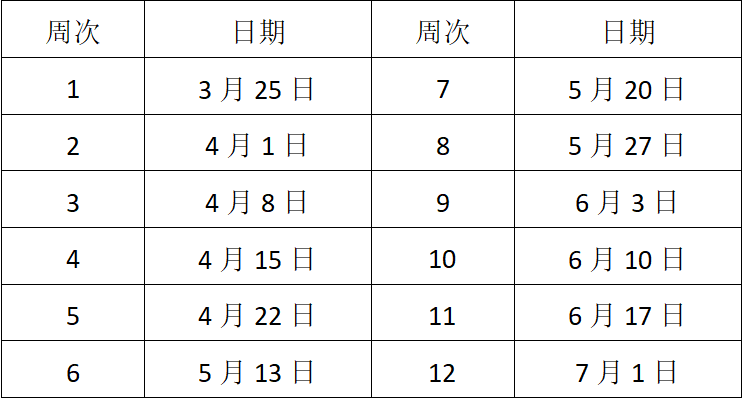 每班共上課12周,每周1次課,每次課90分鐘,共計(jì)12次課24學(xué)時(shí)。上課時(shí)間詳見(jiàn)教學(xué)計(jì)劃(如遇特殊情況,課程將會(huì)適當(dāng)調(diào)整)。