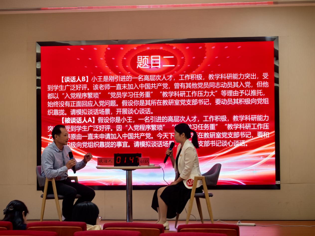 本屆大賽自10月啟動以來,先后完成了“主題黨日策劃”與“黨務(wù)知識測試”兩項賽程。10月22日于藝新樓進(jìn)行的“談心談話”與“微黨課”環(huán)節(jié)中,通識教育學(xué)院代表隊與各二級學(xué)院優(yōu)秀黨務(wù)干部同場競技,展現(xiàn)出扎實(shí)的黨務(wù)功底與職業(yè)素養(yǎng)。