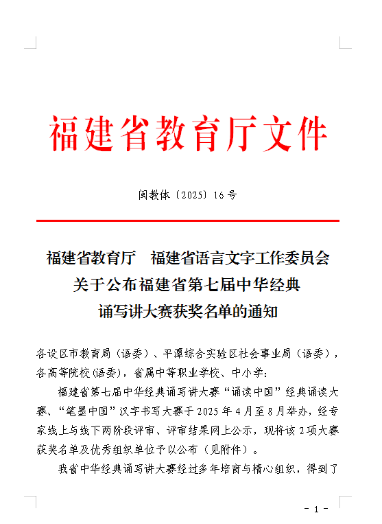 近日,福建省教育廳、福建省語言文字工作委員會聯(lián)合公布了福建省第七屆中華經(jīng)典誦寫講大賽獲獎名單,由我校教師吳婷婷、于曉凌共同指導24級汽車學院汽車制造與試驗技術(3+2)1班葉文濤的朗誦作品《大堰河——我的保姆》(節(jié)選)表現(xiàn)優(yōu)異,榮獲職業(yè)院校學生組省一等獎,并獲得該比賽國賽的入場券。